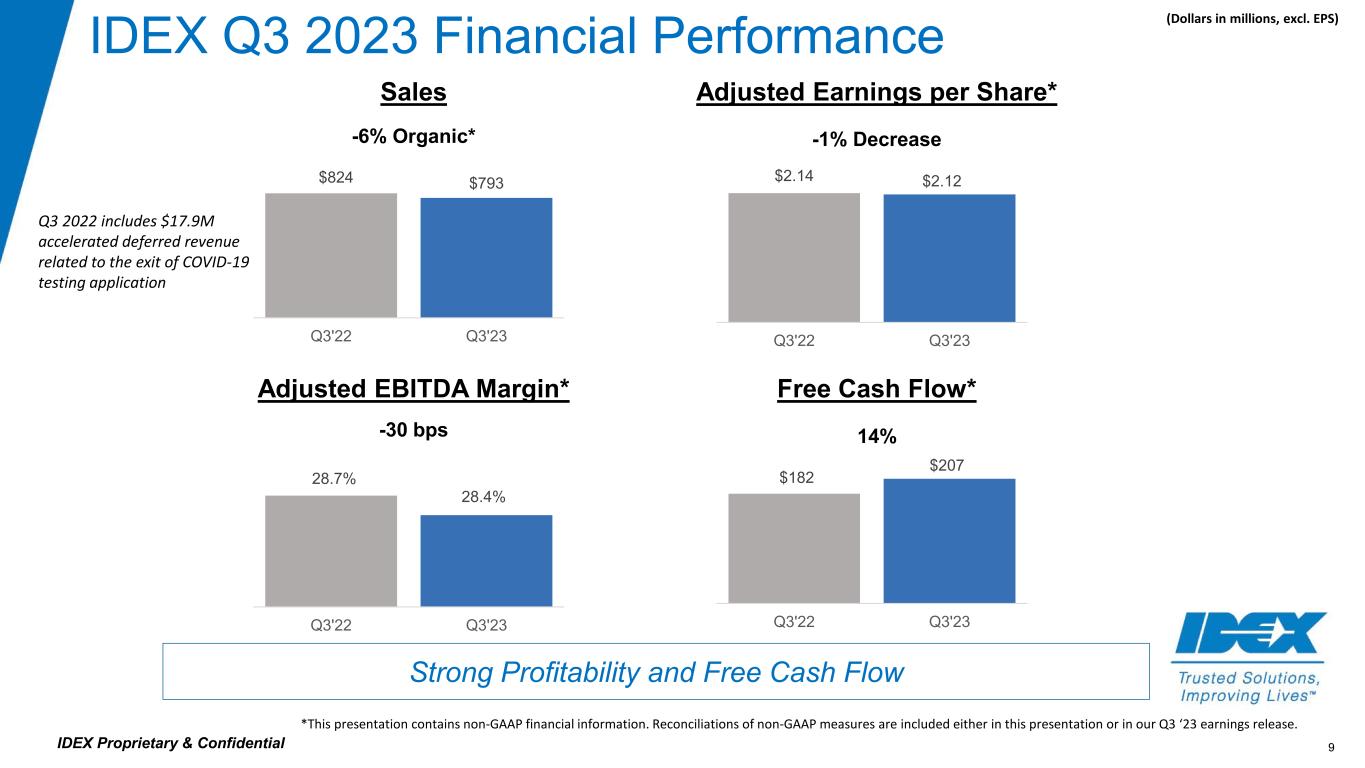 4IDEX Proprietary & Confidential Cautionary Statement Cautionary Statement Under the Private Securities Litigation Reform Act; Non-GAAP Measures This presentation contains “forward-looking” statements within the meaning of the Private Securities Litigation Reform Act of 1995, as amended. These statements may relate to, among other things, the Company’s fourth quarter 2023 and full year 2023 outlook including expected organic sales projections, expected earnings per share and adjusted earnings per share, and the assumptions underlying these expectations, anticipated future acquisition behavior, expectations regarding customer destocking efforts and future order stabilization and lead time, availability of cash and financing alternatives and the anticipated benefits of the Company’s recent acquisitions, and are indicated by words or phrases such as “anticipates,” “estimates,” “plans,” “guidance,” “expects,” “projects,” “forecasts,” “should,” “could,” “will,” “management believes,” “the Company believes,” “the Company intends” and similar words or phrases. These statements are subject to inherent uncertainties and risks that could cause actual results to differ materially from those anticipated at the date of this presentation. The risks and uncertainties include, but are not limited to, the following: levels of industrial activity and economic conditions in the U.S. and other countries around the world, including uncertainties in the financial markets and adverse developments affecting the financial services industry; pricing pressures, including inflation and rising interest rates, and other competitive factors and levels of capital spending in certain industries, all of which could have a material impact on order rates and the Company’s results; the impact of health epidemics and pandemics and terrorist attacks and wars, which could have an adverse impact on the Company's business by creating disruptions in the global supply chain and by potentially having an adverse impact on the global economy; the Company’s ability to make acquisitions and to integrate and operate acquired businesses on a profitable basis; the relationship of the U.S. dollar to other currencies and its impact on pricing and cost competitiveness; political and economic conditions in foreign countries in which the Company operates; developments with respect to trade policy and tariffs; capacity utilization and the effect this has on costs; labor markets; supply chain conditions; market conditions and material costs; risks related to environmental, social and corporate governance issues, including those related to climate change and sustainability; and developments with respect to contingencies, such as litigation and environmental matters. Additional factors that could cause actual results to differ materially from those reflected in the forward-looking statements include, but are not limited to, the risks discussed in the “Risk Factors” section included in the Company’s most recent annual report on Form 10-K and the Company’s subsequent quarterly reports filed with the Securities and Exchange Commission (“SEC”) and the other risks discussed in the Company’s filings with the SEC. The forward-looking statements included here are only made as of the date of this presentation, and management undertakes no obligation to publicly update them to reflect subsequent events or circumstances, except as may be required by law. Investors are cautioned not to rely unduly on forward-looking statements when evaluating the information presented here. This presentation contains non-GAAP financial information. Reconciliations of non-GAAP measures are included either in this presentation or our earnings release for the three-month period ending September 30, 2023, which is available on our website.