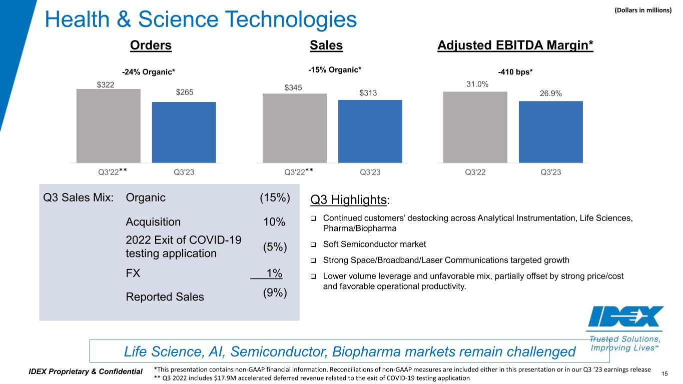 14IDEX Proprietary & Confidential Fluid & Metering Technologies Q3 Highlights: Industrial market slowing as expected Destocking within Agriculture market Strong Chemical and Water markets Steady Energy market with backlog burn Strong price/cost and favorable operational productivity more than offset lower volume leverage Market slowing as expected with continued strong profitability (Dollars in millions) Q3 Sales Mix: Organic (1%) Acquisition/Divestiture (2%) FX 1% Reported Sales (2%) *This presentation contains non-GAAP financial information. Reconciliations of non-GAAP measures are included either in this presentation or in our Q3 ‘23 earnings release. 33.9% 34.4% Q3'22 Q3'23 Orders Sales Adjusted EBITDA Margin* $311 $294 Q3'22 Q3'23 +50 bps* $308 $301 Q3'22 Q3'23 -5% Organic* -1% Organic*