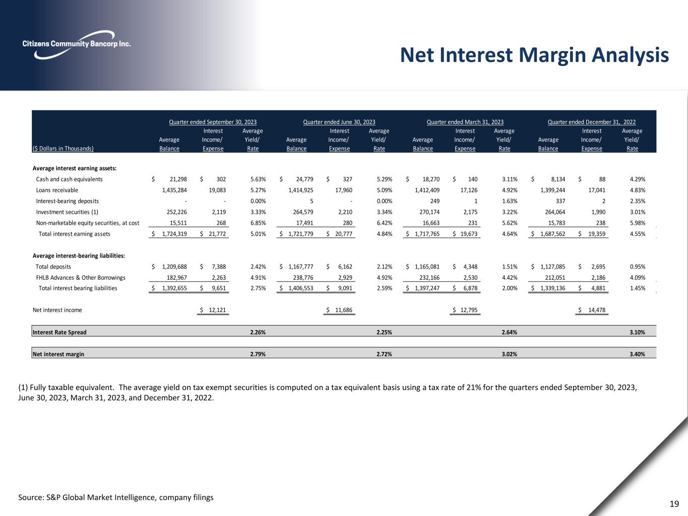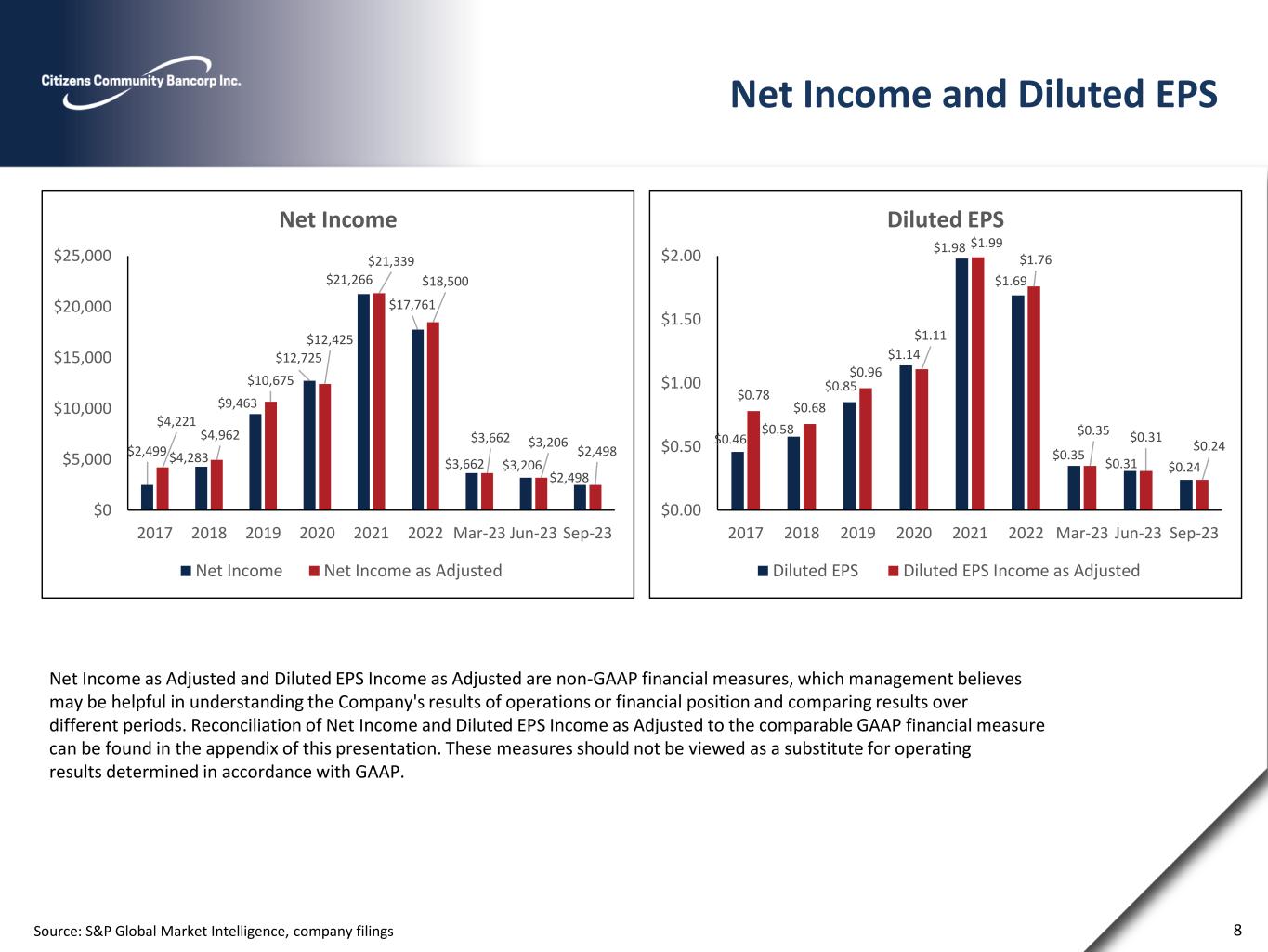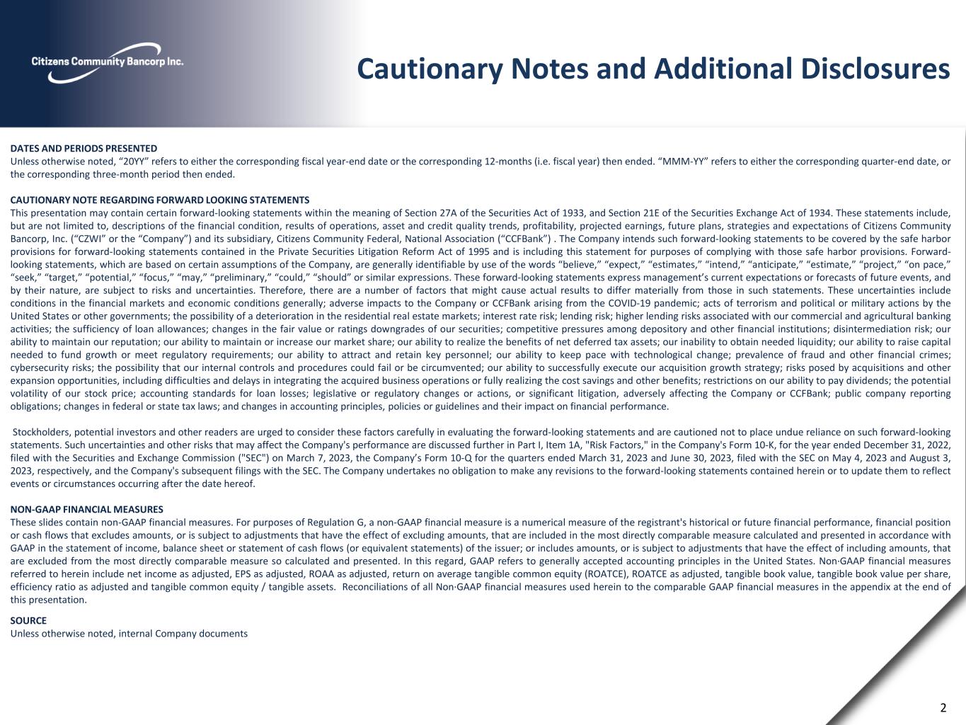 Cautionary Notes and Additional Disclosures 2 DATES AND PERIODS PRESENTED Unless otherwise noted, “20YY” refers to either the corresponding fiscal year-end date or the corresponding 12-months (i.e. fiscal year) then ended. “MMM-YY” refers to either the corresponding quarter-end date, or the corresponding three-month period then ended. CAUTIONARY NOTE REGARDING FORWARD LOOKING STATEMENTS This presentation may contain certain forward-looking statements within the meaning of Section 27A of the Securities Act of 1933, and Section 21E of the Securities Exchange Act of 1934. These statements include, but are not limited to, descriptions of the financial condition, results of operations, asset and credit quality trends, profitability, projected earnings, future plans, strategies and expectations of Citizens Community Bancorp, Inc. (“CZWI” or the “Company”) and its subsidiary, Citizens Community Federal, National Association (“CCFBank”) . The Company intends such forward-looking statements to be covered by the safe harbor provisions for forward-looking statements contained in the Private Securities Litigation Reform Act of 1995 and is including this statement for purposes of complying with those safe harbor provisions. Forward- looking statements, which are based on certain assumptions of the Company, are generally identifiable by use of the words “believe,” “expect,” “estimates,” “intend,” “anticipate,” “estimate,” “project,” “on pace,” “seek,” “target,” “potential,” “focus,” “may,” “preliminary,” “could,” “should” or similar expressions. These forward-looking statements express management’s current expectations or forecasts of future events, and by their nature, are subject to risks and uncertainties. Therefore, there are a number of factors that might cause actual results to differ materially from those in such statements. These uncertainties include conditions in the financial markets and economic conditions generally; adverse impacts to the Company or CCFBank arising from the COVID-19 pandemic; acts of terrorism and political or military actions by the United States or other governments; the possibility of a deterioration in the residential real estate markets; interest rate risk; lending risk; higher lending risks associated with our commercial and agricultural banking activities; the sufficiency of loan allowances; changes in the fair value or ratings downgrades of our securities; competitive pressures among depository and other financial institutions; disintermediation risk; our ability to maintain our reputation; our ability to maintain or increase our market share; our ability to realize the benefits of net deferred tax assets; our inability to obtain needed liquidity; our ability to raise capital needed to fund growth or meet regulatory requirements; our ability to attract and retain key personnel; our ability to keep pace with technological change; prevalence of fraud and other financial crimes; cybersecurity risks; the possibility that our internal controls and procedures could fail or be circumvented; our ability to successfully execute our acquisition growth strategy; risks posed by acquisitions and other expansion opportunities, including difficulties and delays in integrating the acquired business operations or fully realizing the cost savings and other benefits; restrictions on our ability to pay dividends; the potential volatility of our stock price; accounting standards for loan losses; legislative or regulatory changes or actions, or significant litigation, adversely affecting the Company or CCFBank; public company reporting obligations; changes in federal or state tax laws; and changes in accounting principles, policies or guidelines and their impact on financial performance. Stockholders, potential investors and other readers are urged to consider these factors carefully in evaluating the forward-looking statements and are cautioned not to place undue reliance on such forward-looking statements. Such uncertainties and other risks that may affect the Company's performance are discussed further in Part I, Item 1A, "Risk Factors," in the Company's Form 10-K, for the year ended December 31, 2022, filed with the Securities and Exchange Commission ("SEC") on March 7, 2023, the Company’s Form 10-Q for the quarters ended March 31, 2023 and June 30, 2023, filed with the SEC on May 4, 2023 and August 3, 2023, respectively, and the Company's subsequent filings with the SEC. The Company undertakes no obligation to make any revisions to the forward-looking statements contained herein or to update them to reflect events or circumstances occurring after the date hereof. NON-GAAP FINANCIAL MEASURES These slides contain non-GAAP financial measures. For purposes of Regulation G, a non-GAAP financial measure is a numerical measure of the registrant's historical or future financial performance, financial position or cash flows that excludes amounts, or is subject to adjustments that have the effect of excluding amounts, that are included in the most directly comparable measure calculated and presented in accordance with GAAP in the statement of income, balance sheet or statement of cash flows (or equivalent statements) of the issuer; or includes amounts, or is subject to adjustments that have the effect of including amounts, that are excluded from the most directly comparable measure so calculated and presented. In this regard, GAAP refers to generally accepted accounting principles in the United States. Non·GAAP financial measures referred to herein include net income as adjusted, EPS as adjusted, ROAA as adjusted, return on average tangible common equity (ROATCE), ROATCE as adjusted, tangible book value, tangible book value per share, efficiency ratio as adjusted and tangible common equity / tangible assets. Reconciliations of all Non·GAAP financial measures used herein to the comparable GAAP financial