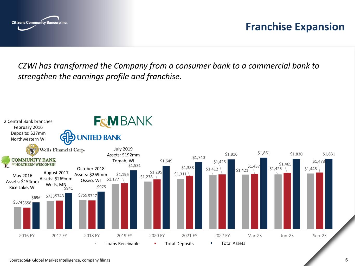 Operating Market Overview CZWI Operates in diverse markets within the northwestern region of Wisconsin, metro Twin Cities and the Mankato, Minnesota MSA Source: S&P Global Market Intelligence 0 0 0 0 0 5