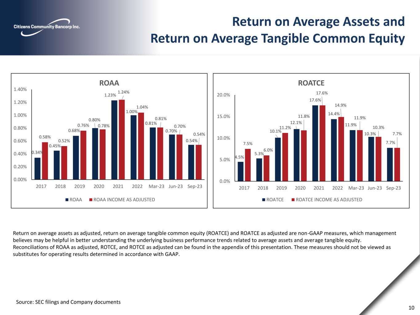 Book Value, Tangible Book Value and Core Net Revenue Detail Source: S&P Global Market Intelligence, company filings Tangible book value per share is a non-GAAP measure which management believes may be helpful in better assessing capital adequacy. The reconciliation of Tangible book value per share can be found in the appendix of this presentation. These measures should not be viewed as substitutes for operating results determined in accordance with GAAP. 9 $9.78 $11.05 $9.89 $11.18 $12.90 $12.77 $12.48 $12.61 $12.61$12.48 $12.46 $13.36 $14.52 $16.27 $16.03 $15.70 $15.81 $15.80 $0.00 $5.00 $10.00 $15.00 $20.00 2017 FY 2018 FY 2019 FY 2020 FY 2021 FY 2022 FY Mar-23 Jun-23 Sep-23 BOOK VALUE AND TANGIBLE BOOK VALUE PER SHARE TANGIBLE BOOK VALUE PER SHARE BOOK VALUE PER SHARE 1 1 $ 2 2 ,8 7 8 $ 2 9 ,7 6 4 $ 4 2 ,6 8 6 $ 4 3 ,6 7 3 $ 4 0 ,5 3 2 $ 4 1 ,7 4 3 $ 2 9 ,9 3 6 $- $10,000 $20,000 $30,000 $40,000 $50,000 $60,000 $70,000 2017 2018 2019 2020 2021 2022 2023 YTD CORE NET REVENUE DETAIL NET INTEREST INCOME NON-INTEREST INCOME NON-INTEREST EXPENSE $58,488 $68,703 $69,491 $27,019 $37,673 $66,799 $44,372