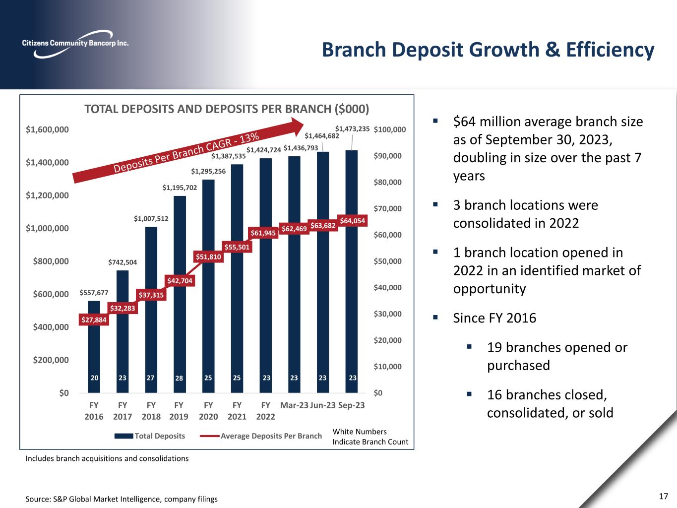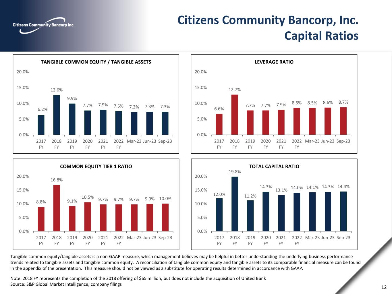 Citizens Community Bancorp, Inc. Capital Ratios Note: 2018 FY represents the completion of the 2018 offering of $65 million, but does not include the acquisition of United Bank Source: S&P Global Market Intelligence, company filings 12 6.6% 12.7% 7.7% 7.7% 7.9% 8.5% 8.5% 8.6% 8.7% 0.0% 5.0% 10.0% 15.0% 20.0% 2017 FY 2018 FY 2019 FY 2020 FY 2021 FY 2022 FY Mar-23 Jun-23 Sep-23 LEVERAGE RATIO 8.8% 16.8% 9.1% 10.5% 9.7% 9.7% 9.7% 9.9% 10.0% 0.0% 5.0% 10.0% 15.0% 20.0% 2017 FY 2018 FY 2019 FY 2020 FY 2021 FY 2022 FY Mar-23 Jun-23 Sep-23 COMMON EQUITY TIER 1 RATIO 12.0% 19.8% 11.2% 14.3% 13.1% 14.0% 14.1% 14.3% 14.4% 0.0% 5.0% 10.0% 15.0% 20.0% 2017 FY 2018 FY 2019 FY 2020 FY 2021 FY 2022 FY Mar-23 Jun-23 Sep-23 TOTAL CAPITAL RATIO Tangible common equity/tangible assets is a non-GAAP measure, which management believes may be helpful in better understanding the underlying business performance trends related to tangible assets and tangible common equity. A reconciliation of tangible common equity and tangible assets to its comparable financial measure can be found in the appendix of the presentation. This measure should not be viewed as a substitute for operating results determined in accordance with GAAP. 6.2% 12.6% 9.9% 7.7% 7.9% 7.5% 7.2% 7.3% 7.3% 0.0% 5.0% 10.0% 15.0% 20.0% 2017 FY 2018 FY 2019 FY 2020 FY 2021 FY 2022 FY Mar-23 Jun-23 Sep-23 TANGIBLE COMMON EQUITY / TANGIBLE ASSETS