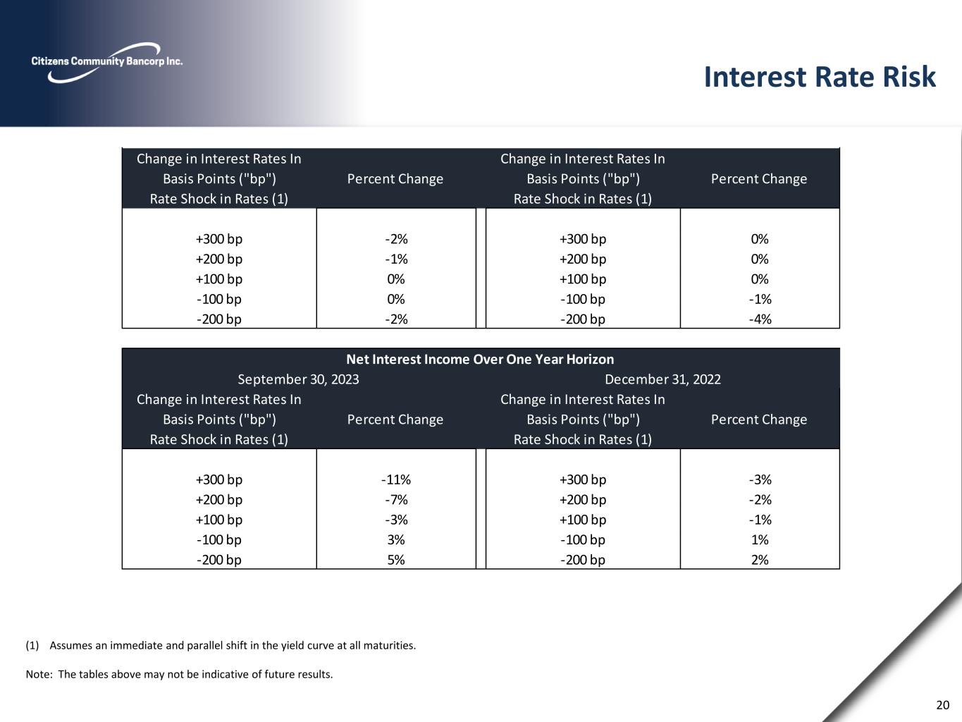 Interest Rate Risk 20 (1) Assumes an immediate and parallel shift in the yield curve at all maturities. Note: The tables above may not be indicative of future results. Change in Interest Rates In Basis Points ("bp") Rate Shock in Rates (1) Percent Change Change in Interest Rates In Basis Points ("bp") Rate Shock in Rates (1) Percent Change +300 bp -2% +300 bp 0% +200 bp -1% +200 bp 0% +100 bp 0% +100 bp 0% -100 bp 0% -100 bp -1% -200 bp -2% -200 bp -4% Change in Interest Rates In Basis Points ("bp") Rate Shock in Rates (1) Percent Change Change in Interest Rates In Basis Points ("bp") Rate Shock in Rates (1) Percent Change +300 bp -11% +300 bp -3% +200 bp -7% +200 bp -2% +100 bp -3% +100 bp -1% -100 bp 3% -100 bp 1% -200 bp 5% -200 bp 2% December 31, 2022September 30, 2023 Net Interest Income Over One Year Horizon