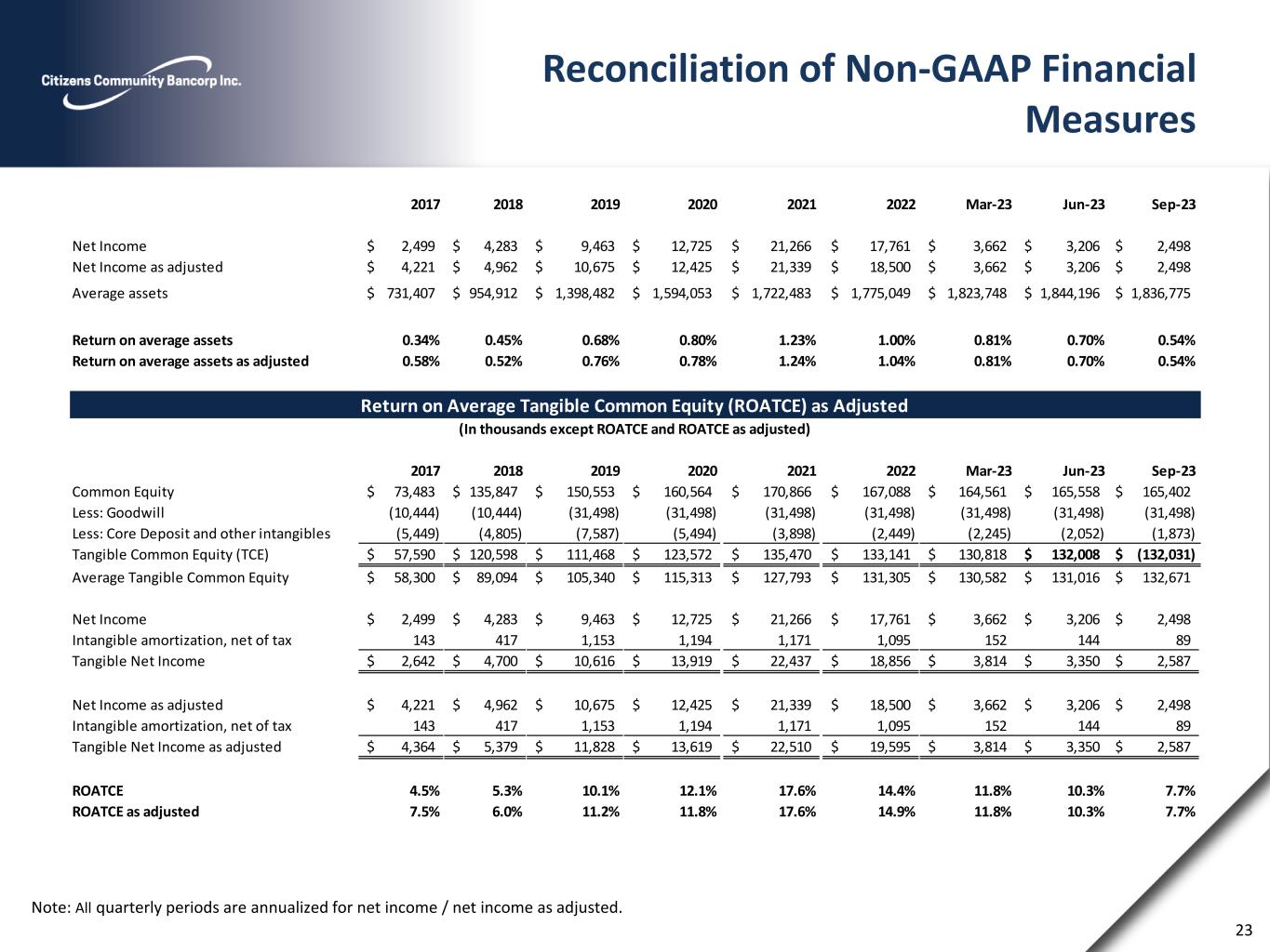 (1) All costs incurred are presented as professional fees and other non-interest expense in the consolidated statement of operations and include costs $0, $0, $0, $0, $0, $0, $341,000, $350,000, and $565,000 for the three months ended September 30, 2023, June 30, 2023 and March 31, 2023 and years ended December 31, 2022, December 31, 2021, December 31, 2020, December 31, 2019, September 30, 2018, and September 30, 2017, respectively, which are nondeductible expenses for federal income tax purposes. (2) Branch closure costs include severance pay recorded in compensation and benefits, accelerated depreciation expense and lease termination fees included in occupancy and other costs included in other non-interest expense in the consolidated statement of operations. In addition, other non-interest expense includes costs related to the reduction in valuation of a closed branch office in the fourth quarter of fiscal 2017 and costs associated with three branch closures during the quarter ended December 31, 2020,one branch closure in the quarter ended September 30, 2022, and two branch closures in the quarter ended December 31, 2022. Professional services includes legal costs related to the sale of the Michigan branch included in these Branch closure costs during the quarter ended March 31, 2019. (3) Settlement proceeds includes litigation income from a JP Morgan Residential Mortgage-Backed Security (RMBS) claim. This JP Morgan RMBS was previously owned by the Bank and sold in 2011. (4) The prepayment fee to restructure our FHLB borrowings is included in other non-interest expense in the consolidated statement of operations. (5) Audit and financial reporting costs include additional audit and professional fees related to the change in our year end from September 30 to December 31, effective December 31, 2018. (6) Net gain on sale of acquired business lines resulted from (1) the sale of Wells Insurance Agency and (2) the termination and sale of the wealth management business line sales contract acquired in a former acquisition. (7) Pretax net income as adjusted and net income as adjusted are non-GAAP measures that management believes enhances the market’s ability to assess the underlying business performance and trends related to core business activities. (8) Provision for income tax on pre-tax income as adjusted is calculated at our effective tax rate for each respective period presented. (9) Tax impact of certain acquired BOLI policies from United Bank. (10) As a result of the Tax Cuts and Jobs Act of 2017, we recorded a one-time net tax provision of $338,000 in 2018, which is included in provision for income taxes expense in the consolidated statement of operations. 22 Reconciliation of Non-GAAP Financial Measures