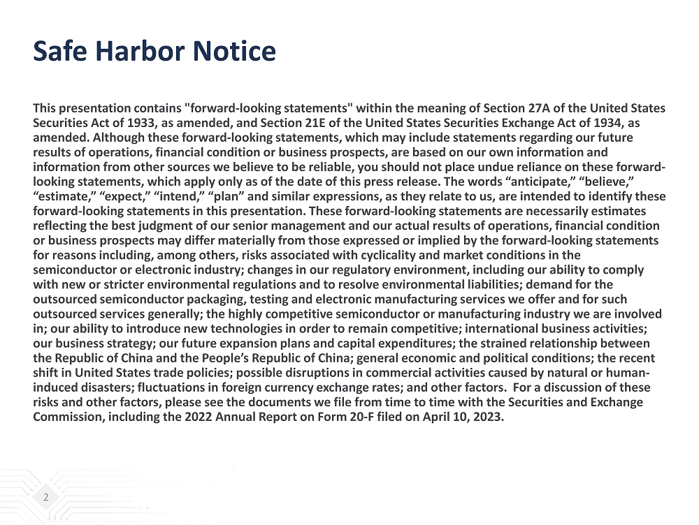 Safe Harbor Notice This presentation contains "forward - looking statements" within the meaning of Section 27A of the United States Securities Act of 1933, as amended, and Section 21E of the United States Securities Exchange Act of 1934, as amended. Although these forward - looking statements, which may include statements regarding our future results of operations, financial condition or business prospects, are based on our own information and information from other sources we believe to be reliable, you should not place undue reliance on these forward - looking statements, which apply only as of the date of this press release. The words “anticipate,” “believe,” “estimate,” “expect,” “intend,” “plan” and similar expressions, as they relate to us, are intended to identify these forward - looking statements in this presentation. These forward - looking statements are necessarily estimates reflecting the best judgment of our senior management and our actual results of operations, financial condition or business prospects may differ materially from those expressed or implied by the forward - looking statements for reasons including, among others, risks associated with cyclicality and market conditions in the semiconductor or electronic industry; changes in our regulatory environment, including our ability to comply with new or stricter environmental regulations and to resolve environmental liabilities; demand for the outsourced semiconductor packaging, testing and electronic manufacturing services we offer and for such outsourced services generally; the highly competitive semiconductor or manufacturing industry we are involved in; our ability to introduce new technologies in order to remain competitive; international business activities; our business strategy; our future expansion plans and capital expenditures; the strained relationship between the Republic of China and the People’s Republic of China; general economic and political conditions; the recent shift in United States trade policies; possible disruptions in commercial activities caused by natural or human - induced disasters; fluctuations in foreign currency exchange rates; and other factors. For a discussion of these risks and other factors, please see the documents we file from time to time with the Securities and Exchange Commission, including the 2022 Annual Report on Form 20 - F filed on April 10, 2023 . 2