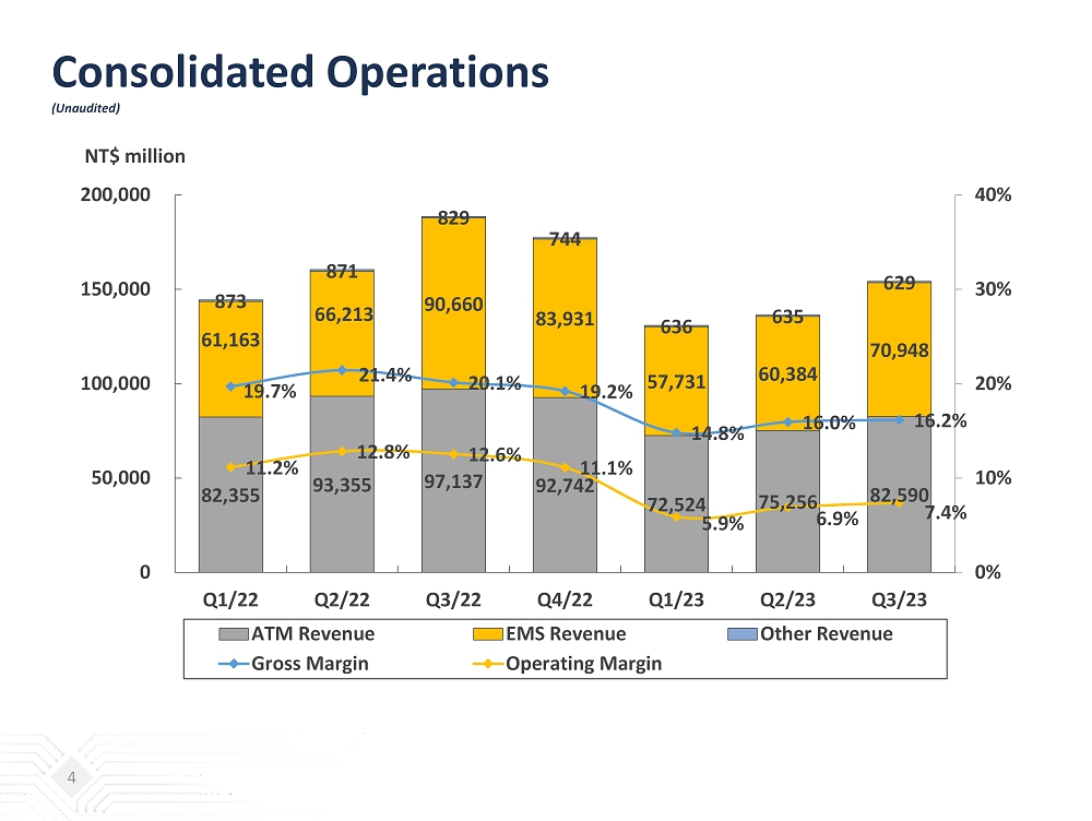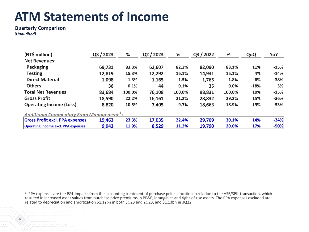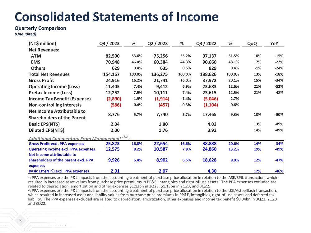 Consolidated Statements of Income Quarterly Comparison (Unaudited) 3 (NT$ million) Q3 / 2023 % Q2 / 2023 % Q3 / 2022 % QoQ YoY Net Revenues: ATM 82,590 53.6% 75,256 55.2% 97,137 51.5% 10% -15% EMS 70,948 46.0% 60,384 44.3% 90,660 48.1% 17% -22% Others 629 0.4% 635 0.5% 829 0.4% -1% -24% Total Net Revenues 154,167 100.0% 136,275 100.0% 188,626 100.0% 13% -18% Gross Profit 24,916 16.2% 21,741 16.0% 37,972 20.1% 15% -34% Operating Income (Loss) 11,405 7.4% 9,412 6.9% 23,683 12.6% 21% -52% Pretax Income (Loss) 12,252 7.9% 10,111 7.4% 23,615 12.5% 21% -48% Income Tax Benefit (Expense) (2,890) -1.9% (1,914) -1.4% (5,046) -2.7% Non-controlling Interests (586) -0.4% (457) -0.3% (1,104) -0.6% Net Income Attributable to Shareholders of the Parent 8,776 5.7% 7,740 5.7% 17,465 9.3% 13% -50% Basic EPS(NT$) 2.04 1.80 4.03 13% -49% Diluted EPS(NT$) 2.00 1.76 3.92 14% -49% Additional Commentary From Management 1&2 : Gross Profit excl. PPA expenses 25,823 16.8% 22,654 16.6% 38,888 20.6% 14% -34% Operating Income excl. PPA expenses 12,575 8.2% 10,587 7.8% 24,860 13.2% 19% -49% Net income attributable to shareholders of the parent excl. PPA expenses 9,926 6.4% 8,902 6.5% 18,628 9.9% 12% -47% Basic EPS(NT$) excl. PPA expenses 2.31 2.07 4.30 12% -46% 1 : PPA expenses are the P&L impacts from the accounting treatment of purchase price allocation in relation to the ASE/SPIL trans act ion, which resulted in increased asset values from purchase price premiums in PP&E, intangibles and right - of - use assets. The PPA expenses excluded are related to depreciation, amortization and other expenses $1.12bn in 3Q23, $1.13bn in 2Q23, and 3Q22. 2 : PPA expenses are the P&L impacts from the accounting treatment of purchase price allocation in relation to the USI/ Asteelflash transaction, which resulted in increased asset and liability values from purchase price premiums in PP&E, intangibles, right - of - use assets an d deferred tax liability. The PPA expenses excluded are related to depreciation, amortization, other expenses and income tax benefit $0.04bn in 3Q23, 2Q23 and 3Q22 .
