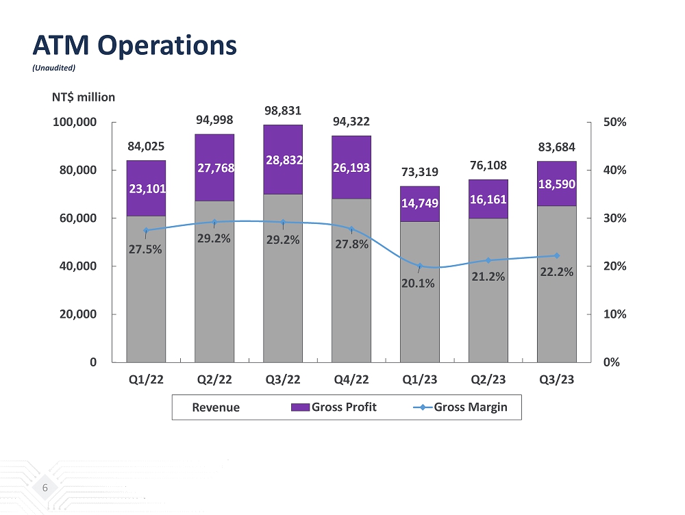 ATM Statements of Income Quarterly Comparison (Unaudited) 5 (NT$ million) Q3 / 2023 % Q2 / 2023 % Q3 / 2022 % QoQ YoY Net Revenues: Packaging 69,731 83.3% 62,607 82.3% 82,090 83.1% 11% -15% Testing 12,819 15.3% 12,292 16.1% 14,941 15.1% 4% -14% Direct Material 1,098 1.3% 1,165 1.5% 1,765 1.8% -6% -38% Others 36 0.1% 44 0.1% 35 0.0% -18% 3% Total Net Revenues 83,684 100.0% 76,108 100.0% 98,831 100.0% 10% -15% Gross Profit 18,590 22.2% 16,161 21.2% 28,832 29.2% 15% -36% Operating Income (Loss) 8,820 10.5% 7,405 9.7% 18,663 18.9% 19% -53% Additional Commentary From Management 1 : Gross Profit excl. PPA expenses 19,463 23.3% 17,035 22.4% 29,709 30.1% 14% -34% Operating Income excl. PPA expenses 9,943 11.9% 8,529 11.2% 19,790 20.0% 17% -50% 1 : PPA expenses are the P&L impacts from the accounting treatment of purchase price allocation in relation to the ASE/SPIL transacti on, which resulted in increased asset values from purchase price premiums in PP&E, intangibles and right - of - use assets. The PPA expenses e xcluded are related to depreciation and amortization $1.12bn in both 3Q23 and 2Q23, and $ 1.13bn in 3Q22.