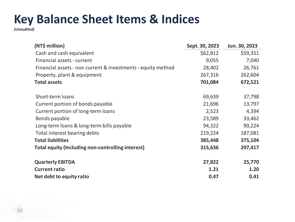 EMS Operations Quarterly Revenues by Application (unaudited) 9 (NT$ million) Q3 / 2023 % Q2 / 2023 % Q3 / 2022 % QoQ YoY EMS Net Revenues 70,970 100.0% 60,424 100.0% 90,665 100.0% 18% -22% Gross Profit 6,470 9.1% 5,639 9.3% 9,198 10.1% 15% -30% Operating Income (Loss) 2,767 3.9% 2,089 3.5% 5,130 5.7% 32% -46% 40% 35% 37% 38% 35% 34% 34% 10% 13% 9% 9% 8% 8% 8% 29% 28% 36% 34% 29% 33% 37% 13% 15% 11% 12% 17% 15% 12% 6% 8% 6% 6% 9% 8% 7% 2% 1% 1% 1% 2% 2% 2% 0% 20% 40% 60% 80% 100% Q1/22 Q2/22 Q3/22 Q4/22 Q1/23 Q2/23 Q3/23 Communication Computing Consumer Industrial Automotive Others