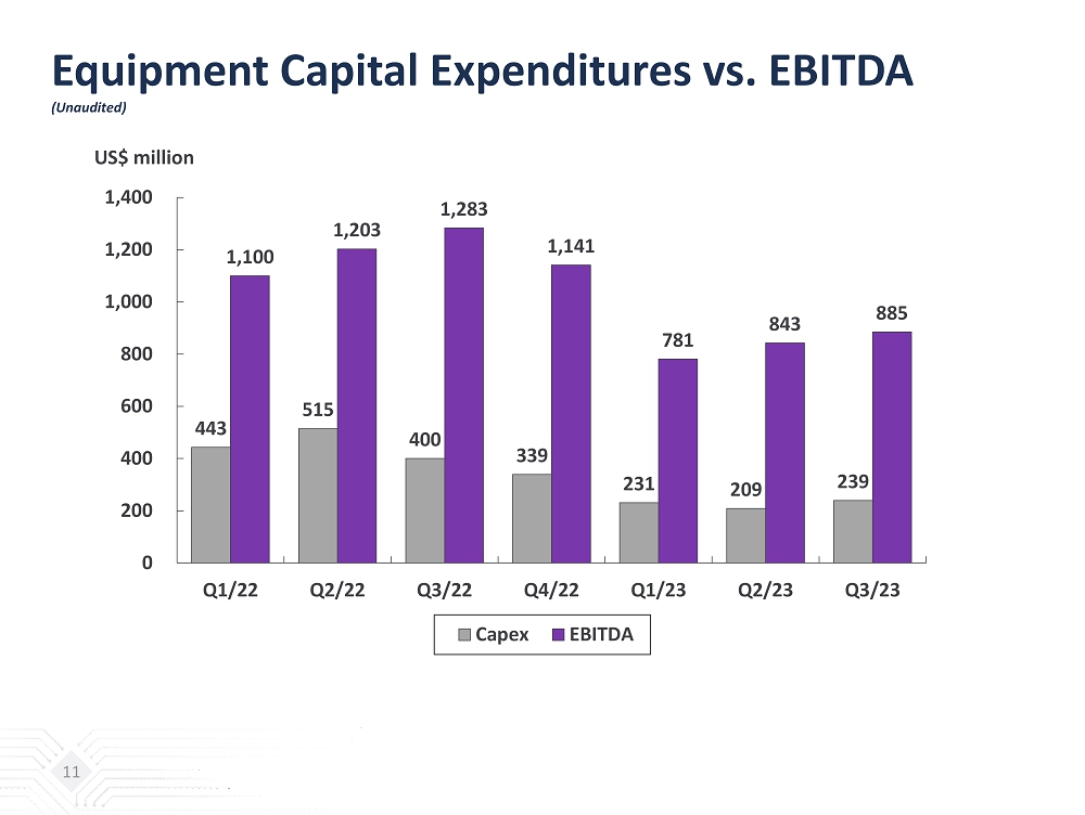 Key Balance Sheet Items & Indices (Unaudited) 10 (NT$ million) Sept. 30, 2023 Jun. 30, 2023 Cash and cash equivalent $62,812 $59,351 Financial assets - current 9,055 7,040 Financial assets - non current & investments - equity method 28,402 26,761 Property, plant & equipment 267,316 262,604 Total assets 701,084 672,521 Short-term loans 69,639 37,798 Current portion of bonds payable 21,696 13,797 Current portion of long-term loans 2,523 4,394 Bonds payable 23,589 33,462 Long-term loans & long-term bills payable 94,322 90,224 Total interest bearing debts 219,224 187,081 Total liabilities 385,448 375,104 Total equity (Including non-controlling interest) 315,636 297,417 Quarterly EBITDA 27,822 25,770 Current ratio 1.21 1.20 Net debt to equity ratio 0.47 0.41