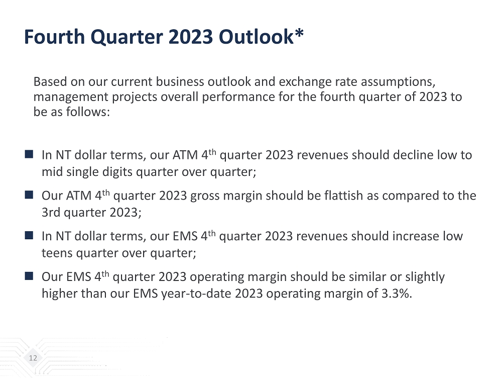 Fourth Quarter 2023 Outlook* Based on our current business outlook and exchange rate assumptions, management projects overall performance for the fourth quarter of 2023 to be as follows: In NT dollar terms, our ATM 4 th quarter 2023 revenues should decline low to mid single digits quarter over quarter ; Our ATM 4 th quarter 2023 gross margin should be flattish as compared to the 3rd quarter 2023; In NT dollar terms, our EMS 4 th quarter 2023 revenues should increase low teens quarter over quarter; Our EMS 4 th quarter 2023 operating margin should be similar or slightly higher than our EMS year - to - date 2023 operating margin of 3.3 %. 12