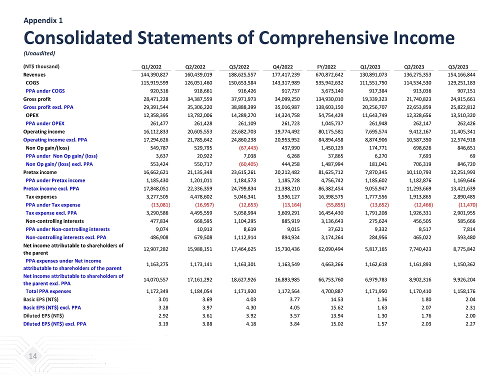 Appendix 1 Consolidated Statements of Comprehensive Income (Unaudited) 14 (NT$ thousand) Q1/2022 Q2/2022 Q3/2022 Q4/2022 FY/2022 Q1/2023 Q2/2023 Q3/2023 Revenues 144,390,827 160,439,019 188,625,557 177,417,239 670,872,642 130,891,073 136,275,353 154,166,844 COGS 115,919,599 126,051,460 150,653,584 143,317,989 535,942,632 111,551,750 114,534,530 129,251,183 PPA under COGS 920,316 918,661 916,426 917,737 3,673,140 917,384 913,036 907,151 Gross profit 28,471,228 34,387,559 37,971,973 34,099,250 134,930,010 19,339,323 21,740,823 24,915,661 Gross profit excl. PPA 29,391,544 35,306,220 38,888,399 35,016,987 138,603,150 20,256,707 22,653,859 25,822,812 OPEX 12,358,395 13,782,006 14,289,270 14,324,758 54,754,429 11,643,749 12,328,656 13,510,320 PPA under OPEX 261,477 261,428 261,109 261,723 1,045,737 261,948 262,147 262,426 Operating income 16,112,833 20,605,553 23,682,703 19,774,492 80,175,581 7,695,574 9,412,167 11,405,341 Operating income excl. PPA 17,294,626 21,785,642 24,860,238 20,953,952 84,894,458 8,874,906 10,587,350 12,574,918 Non Op gain/(loss) 549,787 529,795 (67,443) 437,990 1,450,129 174,771 698,626 846,651 PPA under Non Op gain/ (loss) 3,637 20,922 7,038 6,268 37,865 6,270 7,693 69 Non Op gain/ (loss) excl. PPA 553,424 550,717 (60,405) 444,258 1,487,994 181,041 706,319 846,720 Pretax income 16,662,621 21,135,348 23,615,261 20,212,482 81,625,712 7,870,345 10,110,793 12,251,993 PPA under Pretax income 1,185,430 1,201,011 1,184,573 1,185,728 4,756,742 1,185,602 1,182,876 1,169,646 Pretax income excl. PPA 17,848,051 22,336,359 24,799,834 21,398,210 86,382,454 9,055,947 11,293,669 13,421,639 Tax expenses 3,277,505 4,478,602 5,046,341 3,596,127 16,398,575 1,777,556 1,913,865 2,890,485 PPA under Tax expense (13,081) (16,957) (12,653) (13,164) (55,855) (13,652) (12,466) (11,470) Tax expense excl. PPA 3,290,586 4,495,559 5,058,994 3,609,291 16,454,430 1,791,208 1,926,331 2,901,955 Non-controlling interests 477,834 668,595 1,104,295 885,919 3,136,643 275,624 456,505 585,666 PPA under Non-controlling interests 9,074 10,913 8,619 9,015 37,621 9,332 8,517 7,814 Non-controlling interests excl. PPA 486,908 679,508 1,112,914 894,934 3,174,264 284,956 465,022 593,480 Net income attributable to shareholders of the parent 12,907,282 15,988,151 17,464,625 15,730,436 62,090,494 5,817,165 7,740,423 8,775,842 PPA expenses under Net income attributable to shareholders of the parent 1,163,275 1,173,141 1,163,301 1,163,549 4,663,266 1,162,618 1,161,893 1,150,362 Net income attributable to shareholders of the parent excl. PPA 14,070,557 17,161,292 18,627,926 16,893,985 66,753,760 6,979,783 8,902,316 9,926,204 Total PPA expenses 1,172,349 1,184,054 1,171,920 1,172,564 4,700,887 1,171,950 1,170,410 1,158,176 Basic EPS (NT$) 3.01 3.69 4.03 3.77 14.53 1.36 1.80 2.04 Basic EPS (NT$) excl. PPA 3.28 3.97 4.30 4.05 15.62 1.63 2.07 2.31 Diluted EPS (NT$) 2.92 3.61 3.92 3.57 13.94 1.30 1.76 2.00 Diluted EPS (NT$) excl. PPA 3.19 3.88 4.18 3.84 15.02 1.57 2.03 2.27