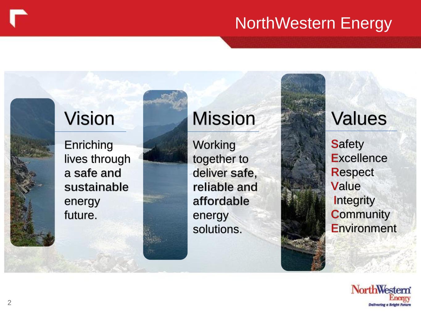 2 Mission Working together to deliver safe, reliable and affordable energy solutions. Vision Enriching lives through a safe and sustainable energy future. Values Safety Excellence Respect Value Integrity Community Environment NorthWestern Energy
