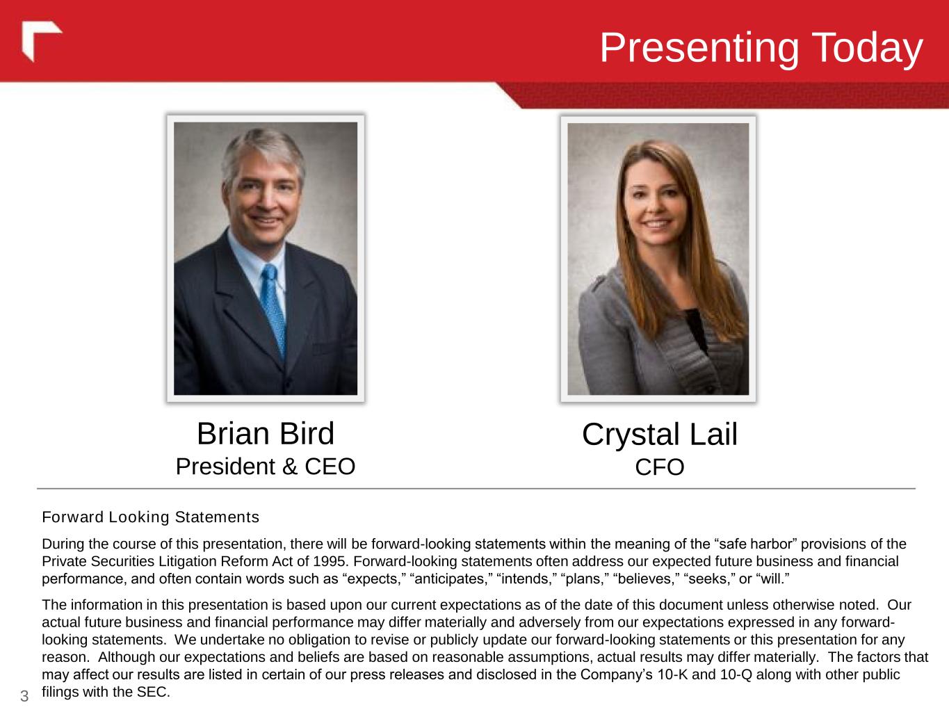 Presenting Today 3 Forward Looking Statements During the course of this presentation, there will be forward-looking statements within the meaning of the “safe harbor” provisions of the Private Securities Litigation Reform Act of 1995. Forward-looking statements often address our expected future business and financial performance, and often contain words such as “expects,” “anticipates,” “intends,” “plans,” “believes,” “seeks,” or “will.” The information in this presentation is based upon our current expectations as of the date of this document unless otherwise noted. Our actual future business and financial performance may differ materially and adversely from our expectations expressed in any forward- looking statements. We undertake no obligation to revise or publicly update our forward-looking statements or this presentation for any reason. Although our expectations and beliefs are based on reasonable assumptions, actual results may differ materially. The factors that may affect our results are listed in certain of our press releases and disclosed in the Company’s 10-K and 10-Q along with other public filings with the SEC. Crystal Lail CFO Brian Bird President & CEO