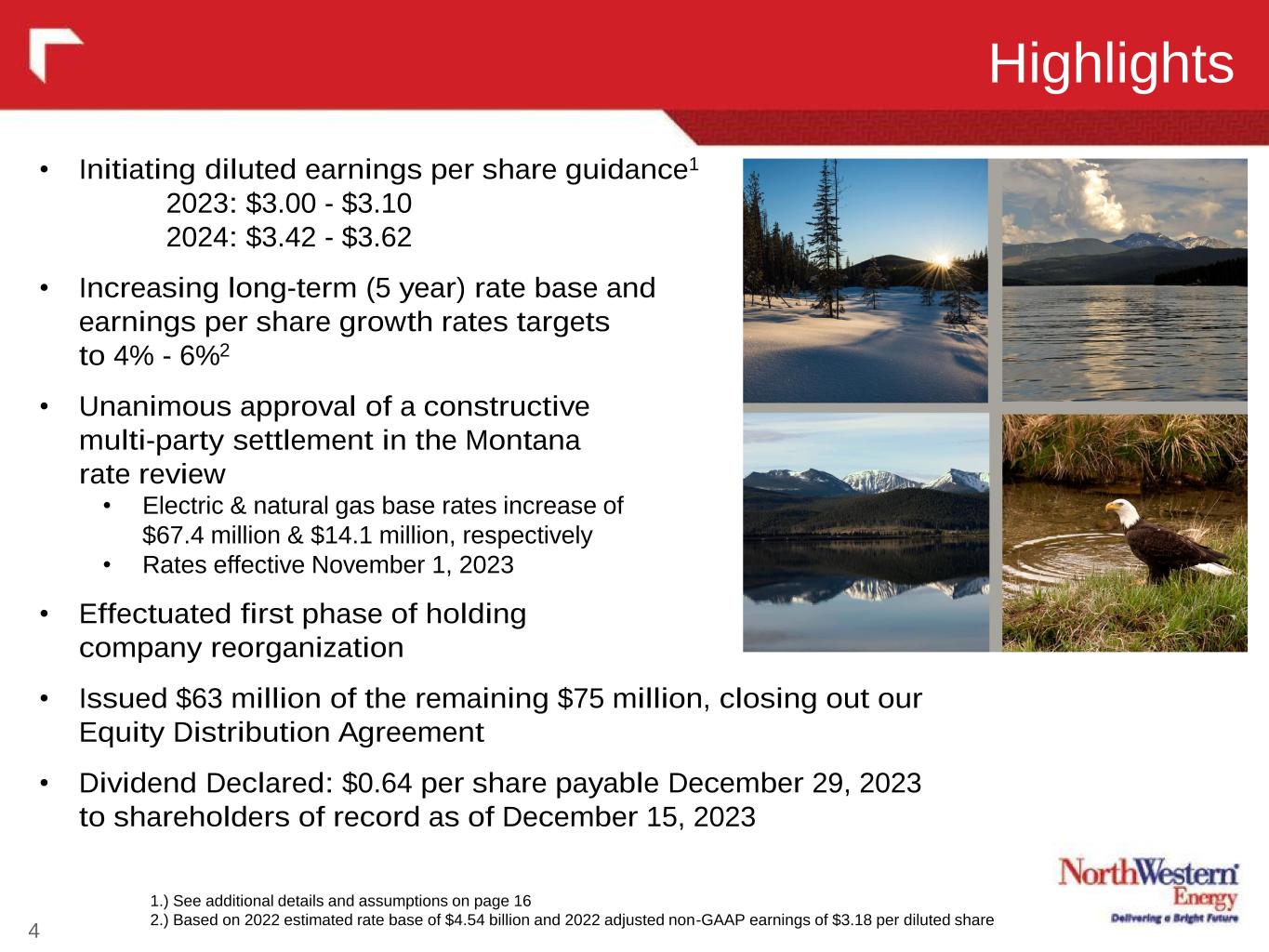 “Our entire team is focused on serving customers with reliable, affordable power, and managing our costs, while we make investments in critical infrastructure and support the growth in our jurisdictions,” said Brian Bird, President and CEO. “This week’s approval of our settlement in Montana provides a solid foundation as we continue execution of our plan. With that, we are announcing an increase to our long-term EPS growth to 4% to 6% and initiating 2023 and 2024 EPS guidance.”