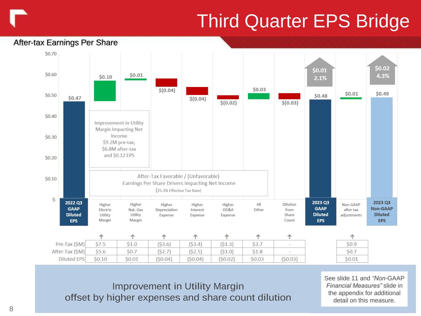 Third Quarter Financial Results 7 (1) (1) Decrease in revenues is primarily related to pass-through supply costs and non-cash regulatory amortizations. (2) Utility Margin is a non-GAAP Measure See appendix slide titled “Explaining Utility Margin” for additional disclosure. (2)