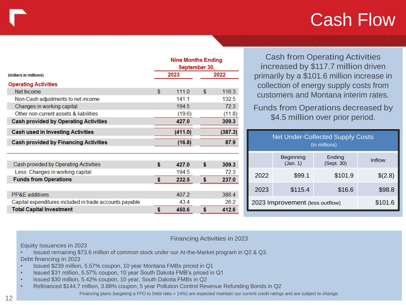 Cash Flow 12 Cash from Operating Activities increased by $117.7 million driven primarily by a $101.6 million increase in collection of energy supply costs from customers and Montana interim rates. Funds from Operations decreased by $4.5 million over prior period. Net Under-Collected Supply Costs (in millions) Beginning (Jan. 1) Ending (Sept. 30) Inflow 2022 $99.1 $101.9 $(2.8) 2023 $115.4 $16.6 $98.8 2023 Improvement (less outflow) $101.6 Financing Activities in 2023 Equity Issuances in 2023 • Issued remaining $73.6 million of common stock under our At-the-Market program in Q2 & Q3. Debt financing in 2023 • Issued $239 million, 5.57% coupon, 10 year Montana FMBs priced in Q1 • Issued $31 million, 5.57% coupon, 10 year South Dakota FMB’s priced in Q1 • Issued $30 million, 5.42% coupon, 10 year, South Dakota FMBs in Q2 • Refinanced $144.7 million, 3.88% coupon, 5 year Pollution Control Revenue Refunding Bonds in Q2 Financing plans (targeting a FFO to Debt ratio > 14%) are expected maintain our current credit ratings and are subject to change.