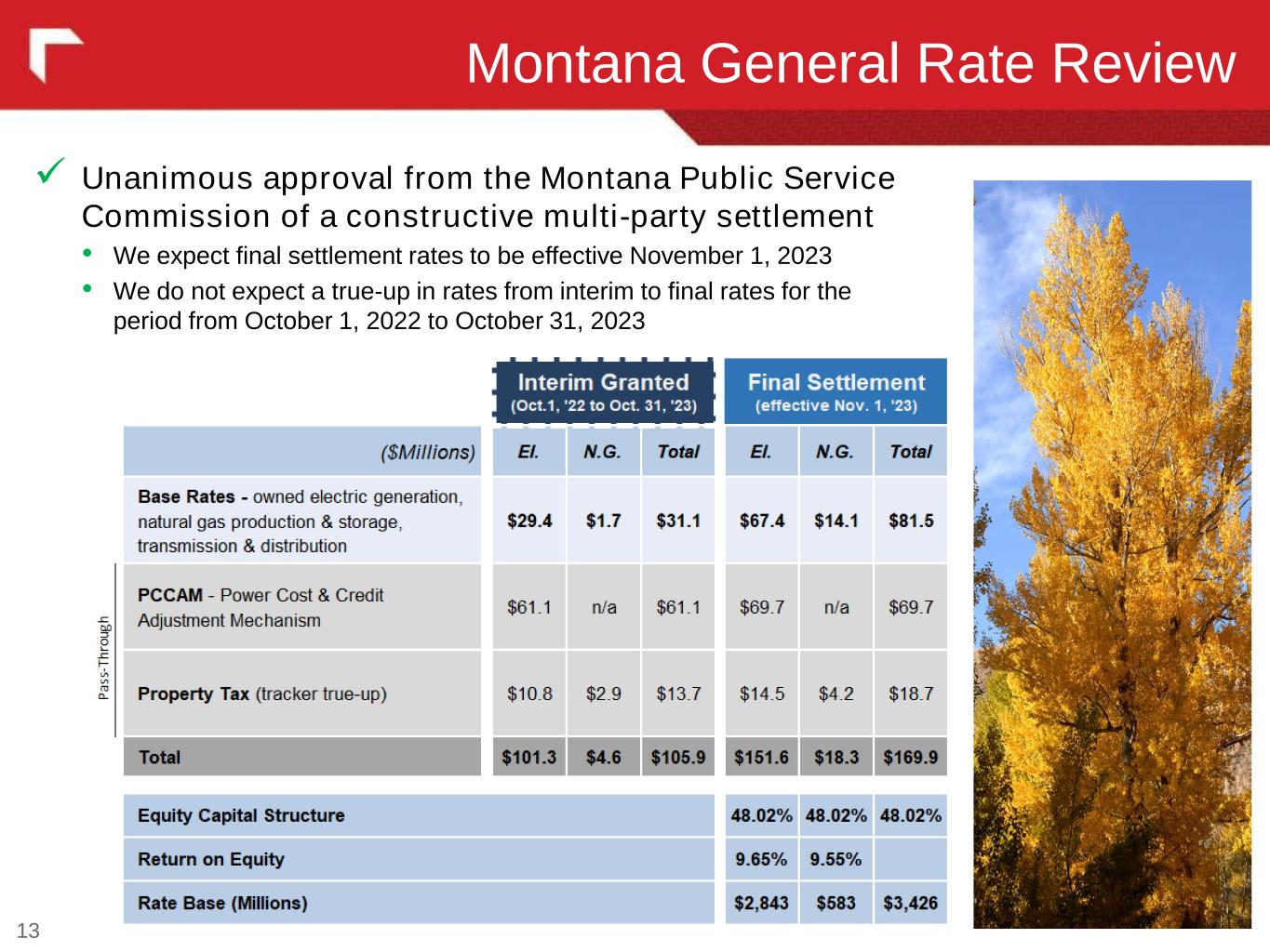 This week, the Montana Public Service Commission (MPSC) approved the settlement agreement filed in April 2023, providing for an increase in base electric rates of $67.4 million and base natural gas rates of $14.1 million. We expect final rates, adjusting from interim to settled rates, to be effective November 1, 2023. Our 2023 earnings through September 30, 2023, reflect revenues from interim rates. Based on the draft order, we do not expect a refund for interim rate revenues collected since their effective date nor a true-up for interim to final rates for the period from October 1, 2022, to October 31, 2023. See further details below.