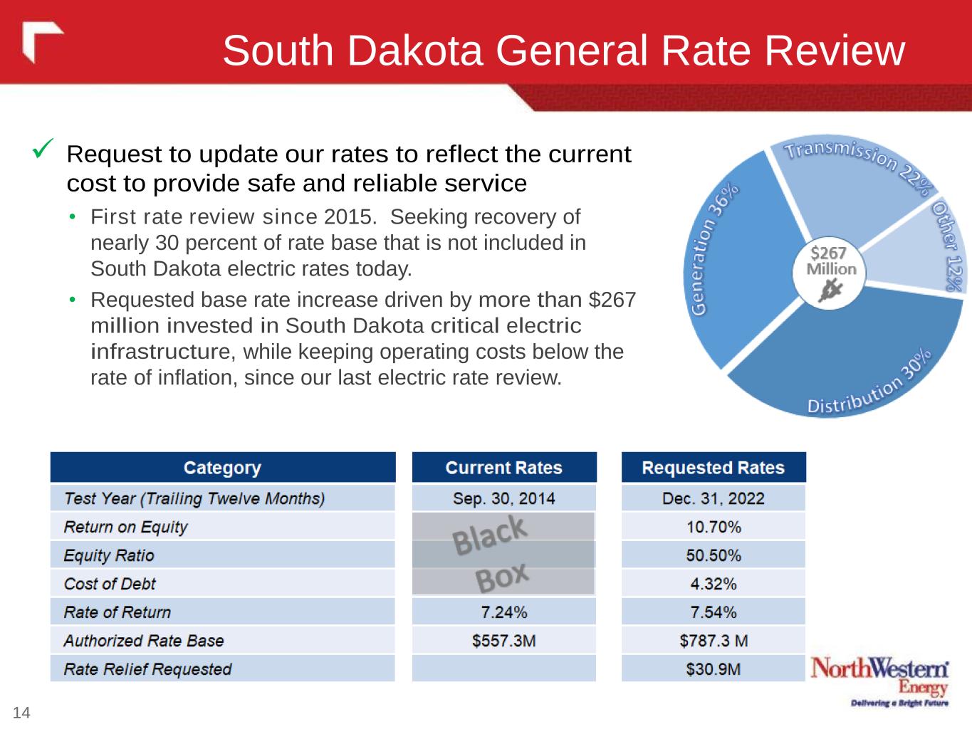 • Constructive outcomes in our current South Dakota rate review and regulatory proceedings