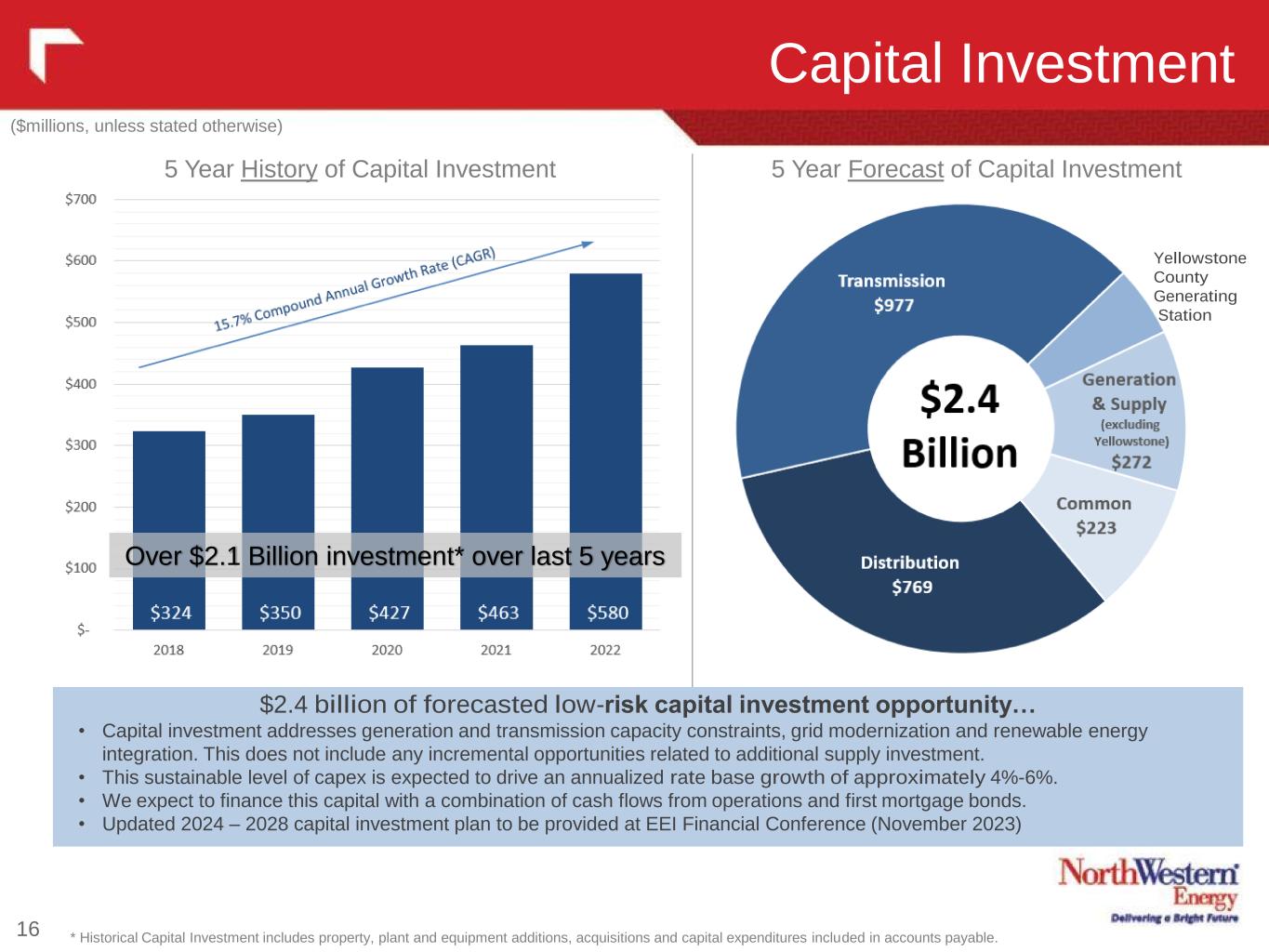 Strong Outlook & 2024 Earnings Guidance 15 This guidance range is based upon, but not limited to, the following major assumptions: • Final approval of all material aspects of the Montana general rate review settlement agreement • Constructive outcomes in our current South Dakota rate review and regulatory proceedings • Normal weather in our service territories • An effective income tax rate of approximately 4%-5% for 2023 and 12%-14% for 2024; and • Diluted average shares outstanding of approximately 60.4 million in 2023 and 61.3 million in 2024. Initiating non-GAAP EPS guidance 2023: $3.00 - $3.10 2024: $3.42 - $3.62 Increasing long-term (5 Year) expected growth rates • EPS growth of 4% to 6% (from 3% to 6%) from 2022 base year of $3.18 Non-GAAP • Rate base growth of 4% - 6% (from 4% to 5%) from 2022 base year $4.54 billion. • Continued focus on earned returns driven by financial and operational execution No equity expected to fund the current 5-year capital plan • $510 million capital plan for 2023 on target • $2.4 billion infrastructure investment plan for ‘23–’27 sized to be self-funded • Any equity needs would be driven by opportunities incremental to the plan Targeting FFO > 14% by end of 2024 and beyond Annual dividend growth expected to be below earnings growth until we return to a payout ratio within our targeted 60% to 70%