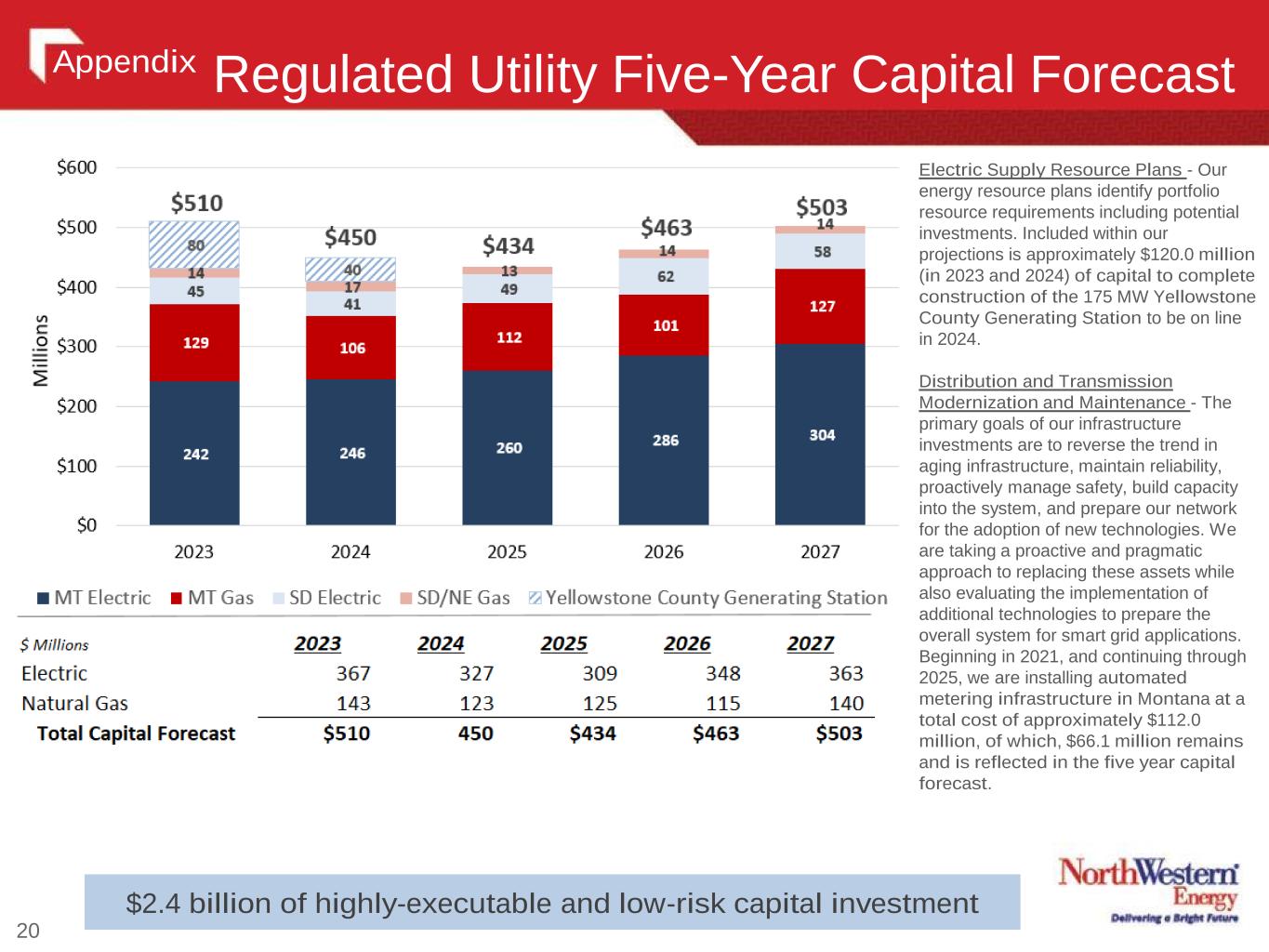 Regulated Utility Five-Year Capital Forecast 20 Appendix $2.4 billion of highly-executable and low-risk capital investment Electric Supply Resource Plans - Our energy resource plans identify portfolio resource requirements including potential investments. Included within our projections is approximately $120.0 million (in 2023 and 2024) of capital to complete construction of the 175 MW Yellowstone County Generating Station to be on line in 2024. Distribution and Transmission Modernization and Maintenance - The primary goals of our infrastructure investments are to reverse the trend in aging infrastructure, maintain reliability, proactively manage safety, build capacity into the system, and prepare our network for the adoption of new technologies. We are taking a proactive and pragmatic approach to replacing these assets while also evaluating the implementation of additional technologies to prepare the overall system for smart grid applications. Beginning in 2021, and continuing through 2025, we are installing automated metering infrastructure in Montana at a total cost of approximately $112.0 million, of which, $66.1 million remains and is reflected in the five year capital forecast.