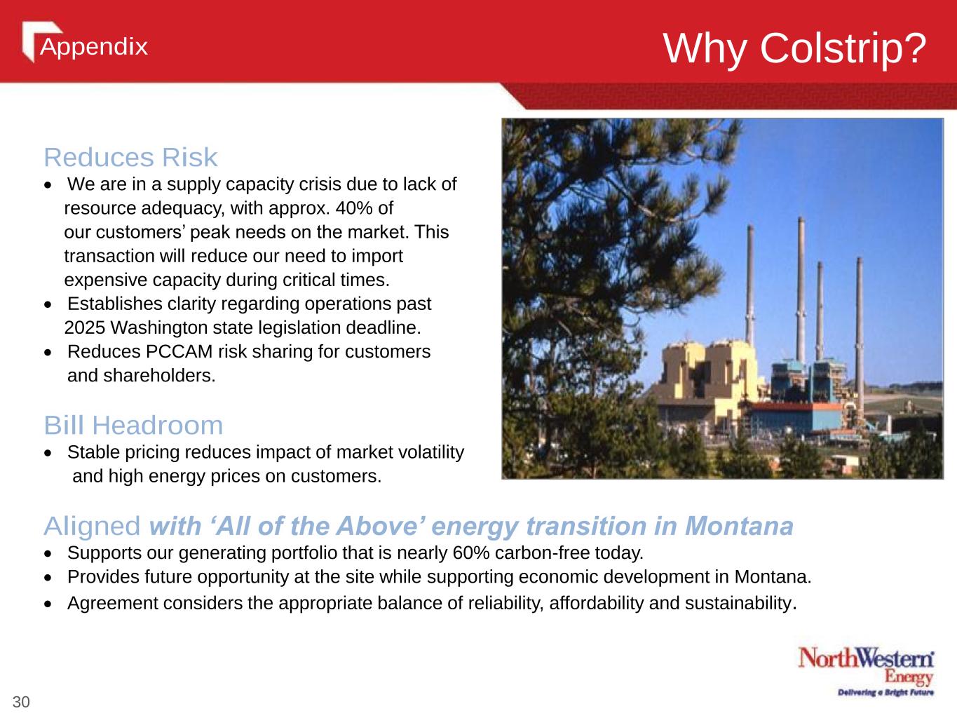 Why Colstrip? 29 Reliable Existing resource, ready to serve our Montana customers. Avoids lengthy planning, permitting and construction of a new facility that would stretch in-service beyond 2026. Reduces reliance on imported power and volatile markets, providing increased energy independence. In-state and on-system asset mitigating the transmission constraints we experience importing capacity. Adds critical long-duration, 24/7 on-demand generation necessary for balancing our existing portfolio. Affordable 222 MW of capacity with no upfront capital costs and stable operating costs going forward. o Equivalent new build would cost in excess of $500 million. o Incremental operating costs are known and reasonable. Resulting variable generation costs represent a 90%+ discount to market prices incurred during December’s polar vortex. In addition to no upfront capital, low and stably priced mine-mouth coal supply costs. Sustainable We remain committed to our net zero goal by 2050. This additional capacity, with a remaining life of up to 20 years, helps bridge the interim gap and will likely lead to less carbon post 2040. Yellowstone County Generating Station is potentially our last natural gas resource addition in Montana. Partners are committed to evaluate non-carbon long-duration alternative resources for the site. Keeps the existing plant open and retains its highly skilled jobs vital to the Colstrip community. Protects existing ownership interests with an ultimate goal of majority ownership of Unit 4. NorthWestern Energy executed an agreement with Avista Corporation for the transfer of Avista’s ownership interests in Colstrip Units 3 & 4. • Effective date of transfer: 12/31/2025 • Generating capacity: 222 MW • Transfer price: $0.00 Appendix