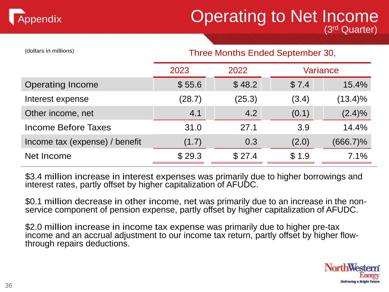 Decrease in operating expenses due to the following factors: $ 3.6 Higher depreciation due to plant additions 0.6 Higher technology implementation and maintenance expense 0.5 Higher insurance expense 0.3 Increase in uncollectible accounts (1.6) Lower other state and local tax expense (0.3) Lower expenses at our electric generation facilities 0.2 Other miscellaneous $ 3.3 Change in Operating Expense Items Impacting Net Income Operating Expenses 35 (3rd Quarter) (dollars in millions) Three Months Ended September 30, 2023 2022 Variance Operating & maintenance $ 53.2 $ 54.7 $ (1.5) (2.7)% Administrative & general 29.4 28.1 1.3 4.6% Property and other taxes 41.8 46.5 (4.7) (10.1)% Depreciation and depletion 52.2 48.6 3.6 7.4% Operating Expenses $ 176.6 $ 177.9 $ (1.3) (0.7)% $ (3.1) Lower property taxes recovered in trackers, offset in revenue (1.7) Lower pension and other postretirement benefits, offset in other income (1) (0.1) Lower natural gas production taxes recovered in trackers, offset in revenue 0.3 Higher operating and maintenance expenses recovered in trackers, offset in revenue $ (4.6) Change in Operating Expense Items Offset Within Net Income $ (1.3) Decrease in Operating Expenses $(0.2) Appendix (1) In order to present the total change in labor and benefits, we have included the change in the non- service cost component of our pension and other postretirement benefits, which is recorded within other income on our Condensed Consolidated Statements of Income. This change is offset within this table as it does not affect our operating expenses.