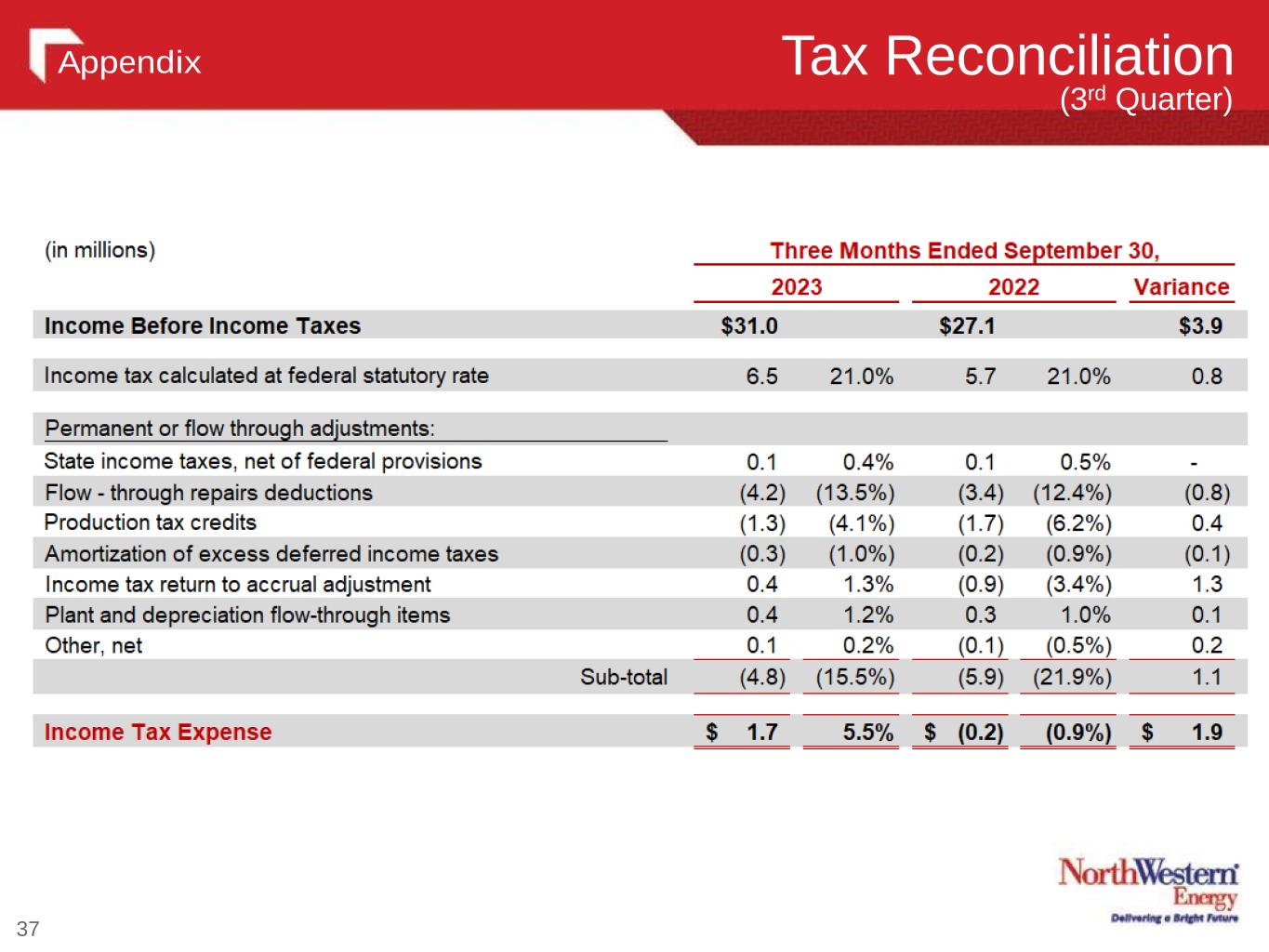 Operating to Net Income 36 (dollars in millions) Three Months Ended September 30, 2023 2022 Variance Operating Income $ 55.6 $ 48.2 $ 7.4 15.4% Interest expense (28.7) (25.3) (3.4) (13.4)% Other income, net 4.1 4.2 (0.1) (2.4)% Income Before Taxes 31.0 27.1 3.9 14.4% Income tax (expense) / benefit (1.7) 0.3 (2.0) (666.7)% Net Income $ 29.3 $ 27.4 $ 1.9 7.1% (3rd Quarter) $3.4 million increase in interest expenses was primarily due to higher borrowings and interest rates, partly offset by higher capitalization of AFUDC. $0.1 million decrease in other income, net was primarily due to an increase in the non- service component of pension expense, partly offset by higher capitalization of AFUDC. $2.0 million increase in income tax expense was primarily due to higher pre-tax income and an accrual adjustment to our income tax return, partly offset by higher flow- through repairs deductions. Appendix