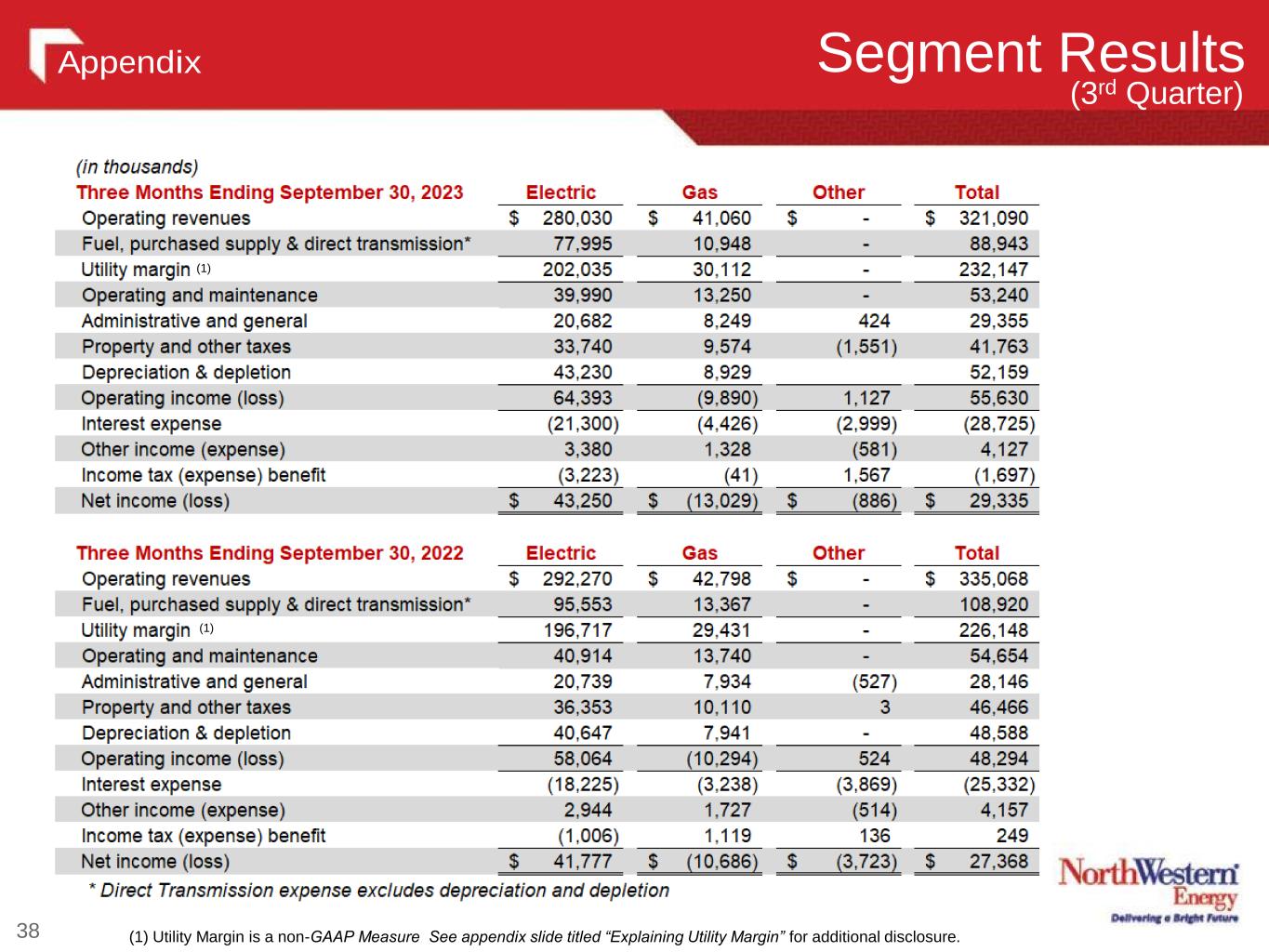 38 Segment ResultsAppendix (1) (1) (3rd Quarter) (1) Utility Margin is a non-GAAP Measure See appendix slide titled “Explaining Utility Margin” for additional disclosure.