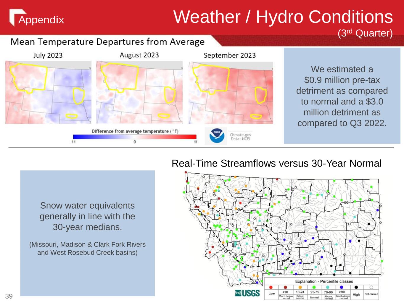 Weather / Hydro Conditions 39 Snow water equivalents generally in line with the 30-year medians. (Missouri, Madison & Clark Fork Rivers and West Rosebud Creek basins) We estimated a $0.9 million pre-tax detriment as compared to normal and a $3.0 million detriment as compared to Q3 2022. Appendix (3rd Quarter) Real-Time Streamflows versus 30-Year Normal