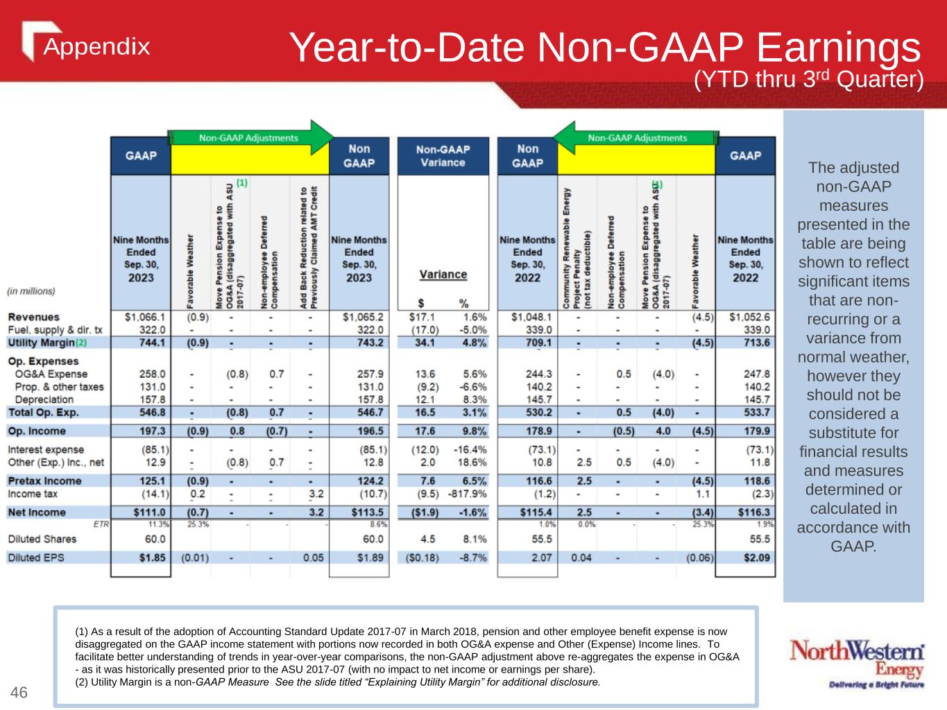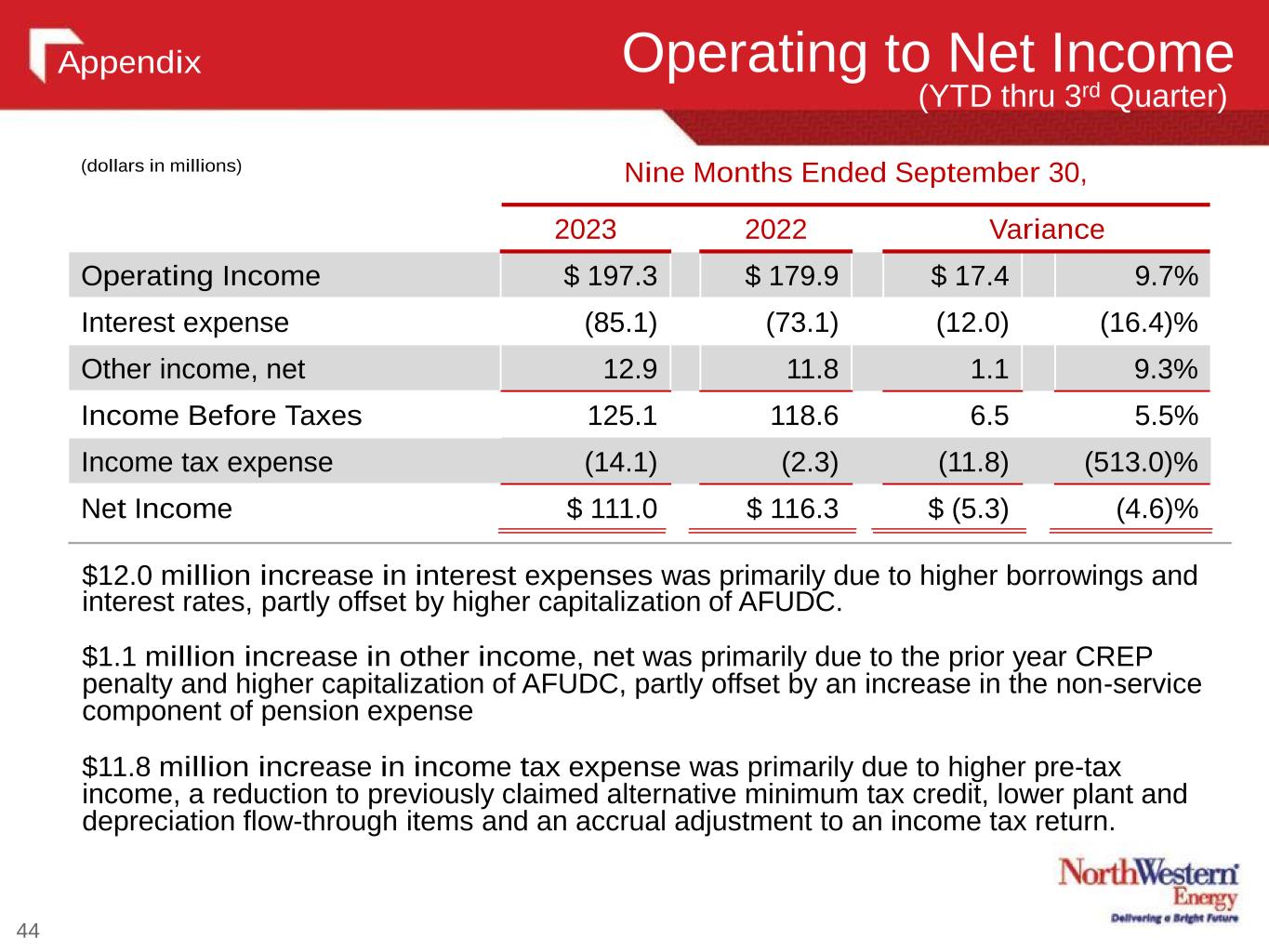 Increase in operating expenses due to the following factors: $ 12.1 Higher depreciation due to plant additions 7.5 Higher labor and benefits (1) 2.9 Higher expenses at our electric generation facilities 1.5 Higher insurance expense 1.4 Increase in uncollectible accounts 0.6 Higher cost of materials 0.2 Higher technology implementation and maintenance expenses (0.9) Lower other state and local tax expense 0.9 Other miscellaneous $ 26.2 Change in Operating Expense Items Impacting Net Income Operating Expenses 43 (YTD thru 3rd Quarter) (dollars in millions) Nine Months Ended September 30, 2023 2022 Variance Operating & maintenance $ 163.9 $ 160.8 $ 3.1 1.9% Administrative & general 94.1 87.0 7.1 8.2% Property and other taxes 131.0 140.2 (9.2) (6.6)% Depreciation and depletion 157.8 145.7 12.1 8.3% Operating Expenses $ 546.8 $ 533.7 $ 13.1 2.5% $ (7.7) Lower property taxes recovered in trackers, offset in revenue (3.2) Lower pension and other postretirement benefits, offset in other income (1.4) Lower operating and maintenance expenses recovered in trackers, offset in revenue (0.6) Lower natural gas production taxes recovered in trackers, offset in revenue (0.2) Lower non-employee directors deferred compensation, offset in other income $ (13.1) Change in Operating Expense Items Offset Within Net Income $ 13.1 Increase in Operating Expenses $10.2 Appendix (1) In order to present the total change in labor and benefits, we have included the change in the non- service cost component of our pension and other postretirement benefits, which is recorded within other income on our Condensed Consolidated Statements of Income. This change is offset within this table as it does not affect our operating expenses.