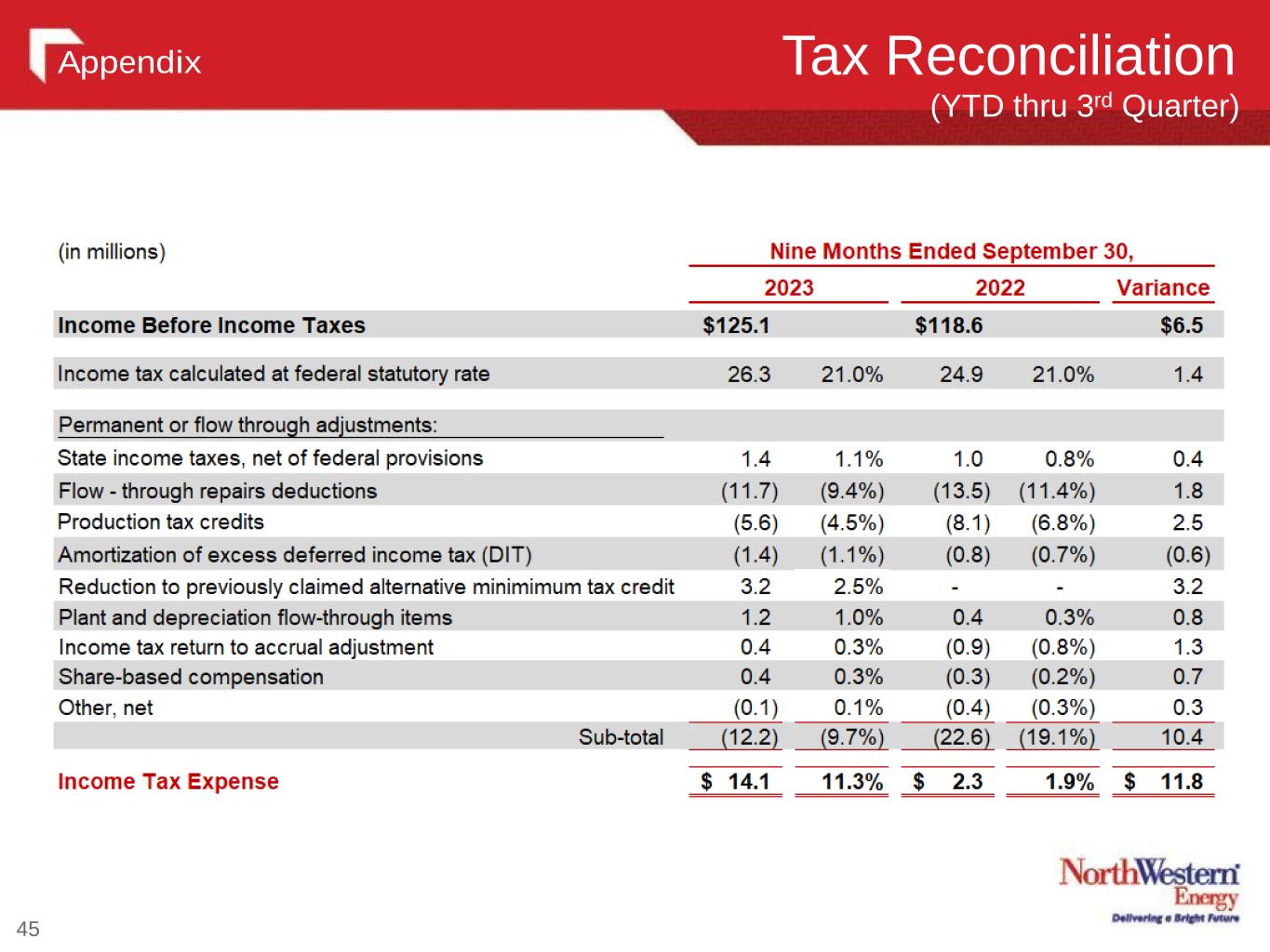 Operating to Net Income 44 (dollars in millions) Nine Months Ended September 30, 2023 2022 Variance Operating Income $ 197.3 $ 179.9 $ 17.4 9.7% Interest expense (85.1) (73.1) (12.0) (16.4)% Other income, net 12.9 11.8 1.1 9.3% Income Before Taxes 125.1 118.6 6.5 5.5% Income tax expense (14.1) (2.3) (11.8) (513.0)% Net Income $ 111.0 $ 116.3 $ (5.3) (4.6)% (YTD thru 3rd Quarter) $12.0 million increase in interest expenses was primarily due to higher borrowings and interest rates, partly offset by higher capitalization of AFUDC. $1.1 million increase in other income, net was primarily due to the prior year CREP penalty and higher capitalization of AFUDC, partly offset by an increase in the non-service component of pension expense $11.8 million increase in income tax expense was primarily due to higher pre-tax income, a reduction to previously claimed alternative minimum tax credit, lower plant and depreciation flow-through items and an accrual adjustment to an income tax return. Appendix