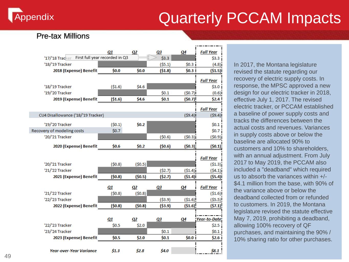 Quarterly PCCAM Impacts 49 Appendix In 2017, the Montana legislature revised the statute regarding our recovery of electric supply costs. In response, the MPSC approved a new design for our electric tracker in 2018, effective July 1, 2017. The revised electric tracker, or PCCAM established a baseline of power supply costs and tracks the differences between the actual costs and revenues. Variances in supply costs above or below the baseline are allocated 90% to customers and 10% to shareholders, with an annual adjustment. From July 2017 to May 2019, the PCCAM also included a "deadband" which required us to absorb the variances within +/- $4.1 million from the base, with 90% of the variance above or below the deadband collected from or refunded to customers. In 2019, the Montana legislature revised the statute effective May 7, 2019, prohibiting a deadband, allowing 100% recovery of QF purchases, and maintaining the 90% / 10% sharing ratio for other purchases. Pre-tax Millions