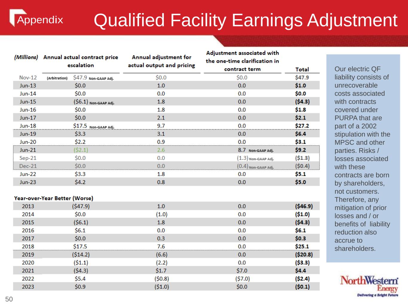 Qualified Facility Earnings Adjustment 50 Appendix Our electric QF liability consists of unrecoverable costs associated with contracts covered under PURPA that are part of a 2002 stipulation with the MPSC and other parties. Risks / losses associated with these contracts are born by shareholders, not customers. Therefore, any mitigation of prior losses and / or benefits of liability reduction also accrue to shareholders.