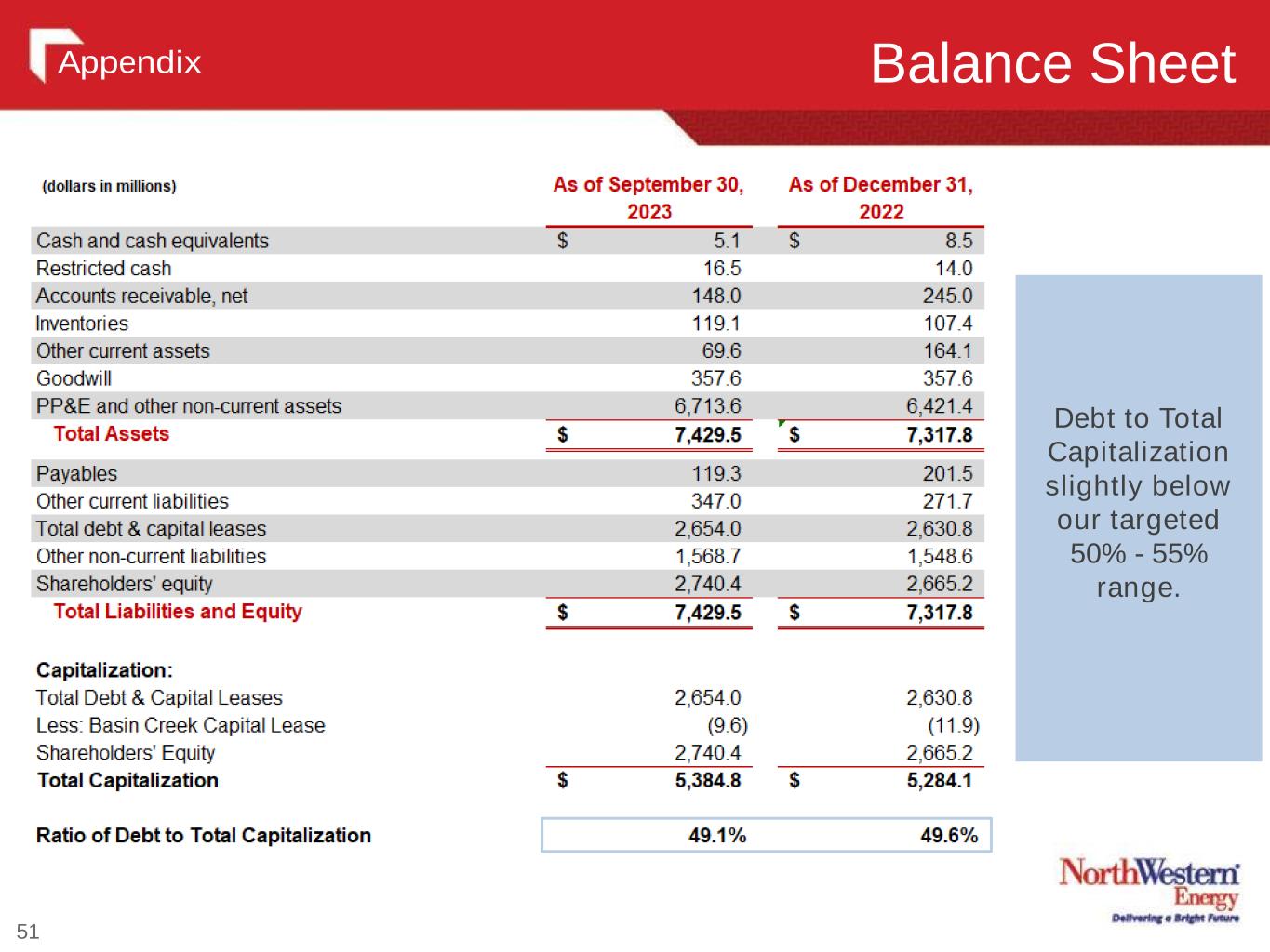 Balance Sheet 51 Debt to Total Capitalization slightly below our targeted 50% - 55% range. Appendix