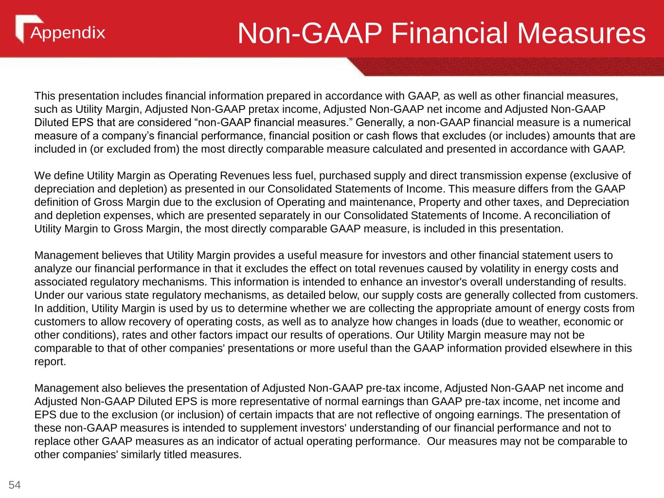 Non-GAAP Financial Measures 54 Appendix This presentation includes financial information prepared in accordance with GAAP, as well as other financial measures, such as Utility Margin, Adjusted Non-GAAP pretax income, Adjusted Non-GAAP net income and Adjusted Non-GAAP Diluted EPS that are considered “non-GAAP financial measures.” Generally, a non-GAAP financial measure is a numerical measure of a company’s financial performance, financial position or cash flows that excludes (or includes) amounts that are included in (or excluded from) the most directly comparable measure calculated and presented in accordance with GAAP. We define Utility Margin as Operating Revenues less fuel, purchased supply and direct transmission expense (exclusive of depreciation and depletion) as presented in our Consolidated Statements of Income. This measure differs from the GAAP definition of Gross Margin due to the exclusion of Operating and maintenance, Property and other taxes, and Depreciation and depletion expenses, which are presented separately in our Consolidated Statements of Income. A reconciliation of Utility Margin to Gross Margin, the most directly comparable GAAP measure, is included in this presentation. Management believes that Utility Margin provides a useful measure for investors and other financial statement users to analyze our financial performance in that it excludes the effect on total revenues caused by volatility in energy costs and associated regulatory mechanisms. This information is intended to enhance an investor's overall understanding of results. Under our various state regulatory mechanisms, as detailed below, our supply costs are generally collected from customers. In addition, Utility Margin is used by us to determine whether we are collecting the appropriate amount of energy costs from customers to allow recovery of operating costs, as well as to analyze how changes in loads (due to weather, economic or other conditions), rates and other factors impact our results of operations. Our Utility Margin measure may not be comparable to that of other companies' presentations or more useful than the GAAP information provided elsewhere in this report. Management also believes the presentation of Adjusted Non-GAAP pre-tax income, Adjusted Non-GAAP net income and Adjusted Non-GAAP Diluted EPS is more representative of normal earnings than GAAP pre-tax income, net income and EPS due to the exclusion (or inclusion) of certain impacts that are not reflective of ongoing earnings. The presentation of these non-GAAP measures is intended to supplement investors' understanding of our financial performance and not to replace other GAAP measures as an indicator of actual operating performance. Our measures may not be comparable to other companies' similarly titled measures.