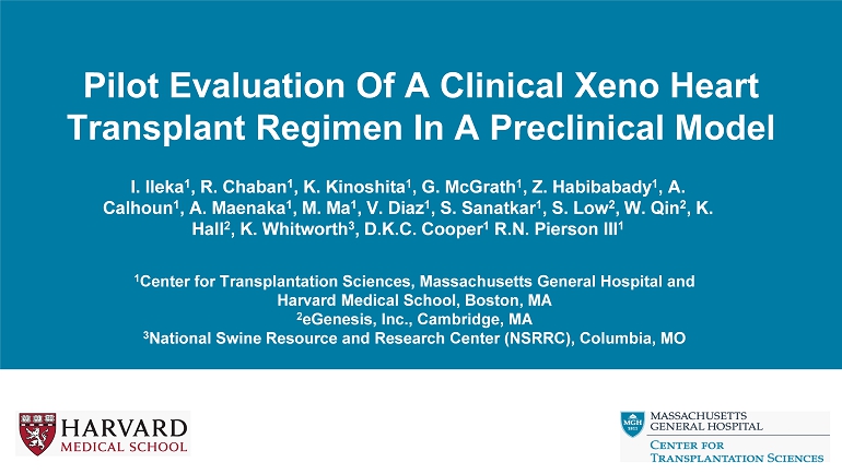 Pilot Evaluation Of A Clinical Xeno Heart Transplant Regimen In A Preclinical Model I. Ileka 1 , R. Chaban 1 , K. Kinoshita 1 , G. McGrath 1 , Z. Habibabady 1 , A. Calhoun 1 , A. Maenaka 1 , M. Ma 1 , V. Diaz 1 , S. Sanatkar 1 , S. Low 2 , W. Qin 2 , K. Hall 2 , K. Whitworth 3 , D.K.C. Cooper 1 R.N. Pierson III 1 1 Center for Transplantation Sciences, Massachusetts General Hospital and Harvard Medical School, Boston, MA 2 eGenesis, Inc., Cambridge, MA 3 National Swine Resource and Research Center (NSRRC), Columbia, MO