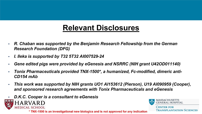 Relevant Disclosures • R. Chaban was supported by the Benjamin Research Fellowship from the German Research Foundation (DFG) • I. Ileka is supported by T32 5T32 AI007529 - 24 • Gene edited pigs were provided by Revivicor and NSRRC (NIH grant U42OD011140) • Tonix Pharmaceuticals provided TNX - 1500*, a humanized, Fc - modified, dimeric anti - CD154 mAb • This work was supported by NIH grants UO1 AI153612 (Pierson), U19 AI090959 (Cooper), and sponsored research agreements with Tonix Pharmaceuticals * TNX - 1500 is an investigational new biologics and is not approved for any indication