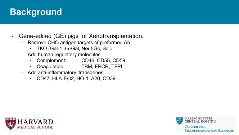 Background • Gene - edited (GE) pigs for Xenotransplantation. – Remove CHO antigen targets of preformed Ab • TKO (Gal - 1,3 - a Gal, Neu5Gc, Sd ) – Add human regulatory molecules • Complement: CD46, CD55, CD59 • Coagulation: TBM, EPCR, TFPI – Add anti - inflammatory ‘transgenes’ • CD47, HLA - E/ b 2, HO - 1, A20, CD39