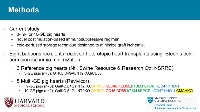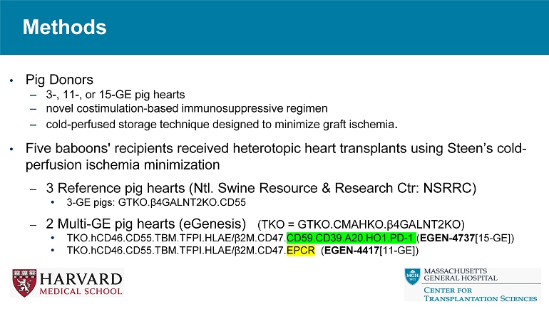 Methods • Pig Donors – 3 - , 11 - , or 15 - GE pig hearts – novel costimulation - based immunosuppressive regimen – cold - perfused storage technique designed to minimize graft ischemia . • Five baboons' recipients received heterotopic heart transplants using Steen’s cold - perfusion ischemia minimization – 3 Reference pig hearts ( Ntl . Swine Resource & Research Ctr: NSRRC) • 3 - GE pigs: GTKO. β4 GALNT2KO.CD55 – 2 Multi - GE pig hearts ( eGenesis ) (TKO = GTKO.CMAHKO. β4 GALNT2KO) • TKO.hCD46.CD55.TBM.TFPI.HLAE/ β2 M.CD47. CD59.CD39.A20.HO1.PD - 1 ( EGEN - 4737 [15 - GE]) • TKO.hCD46.CD55.TBM.TFPI.HLAE/ β2 M.CD47. EPCR ( EGEN - 4417 [11 - GE])