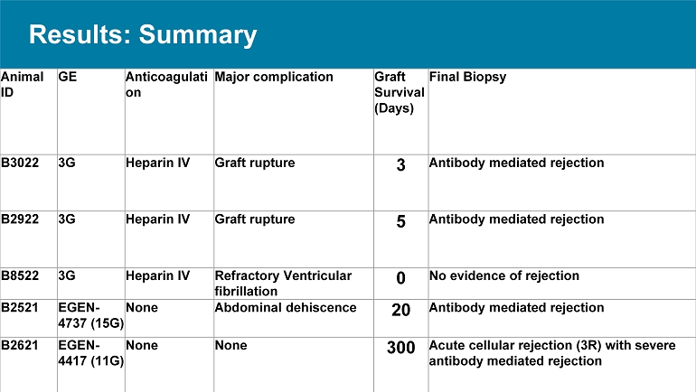 Results: Summary Final Biopsy Graft Survival (Days) Major complication Anticoagulati on GE Animal ID Antibody mediated rejection 3 Graft rupture Heparin IV 3G B3022 Antibody mediated rejection 5 Graft rupture Heparin IV 3G B2922 No evidence of rejection 0 Refractory Ventricular fibrillation Heparin IV 3G B8522 Antibody mediated rejection 20 Abdominal dehiscence None EGEN - 4737 (15G) B2521 Acute cellular rejection (3R) with severe antibody mediated rejection 300 None None EGEN - 4417 (11G) B2621