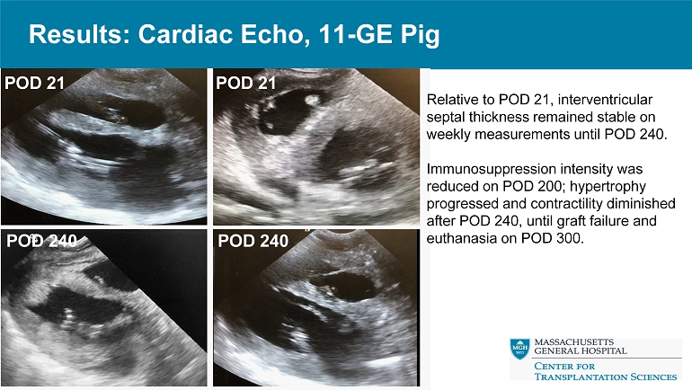 Results: Cardiac Echo, 11 - GE Pig POD 21 POD 21 POD 240 POD 240 Relative to POD 21, interventricular septal thickness remained stable on weekly measurements until POD 240. Immunosuppression intensity was reduced on POD 200; hypertrophy progressed and contractility diminished after POD 240, until graft failure and euthanasia on POD 300.