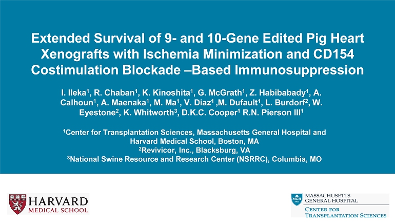 Extended Survival of 9 - and 10 - Gene Edited Pig Heart Xenografts with Ischemia Minimization and CD154 Costimulation Blockade – Based Immunosuppression I. Ileka 1 , R. Chaban 1 , K. Kinoshita 1 , G. McGrath 1 , Z. Habibabady 1 , A. Calhoun 1 , A. Maenaka 1 , M. Ma 1 , V. Diaz 1 ,M. Dufault 1 , L. Burdorf 2 , W. Eyestone 2 , K. Whitworth 3 , D.K.C. Cooper 1 R.N. Pierson III 1 1 Center for Transplantation Sciences, Massachusetts General Hospital and Harvard Medical School, Boston, MA 2 Revivicor, Inc., Blacksburg, VA 3 National Swine Resource and Research Center (NSRRC), Columbia, MO