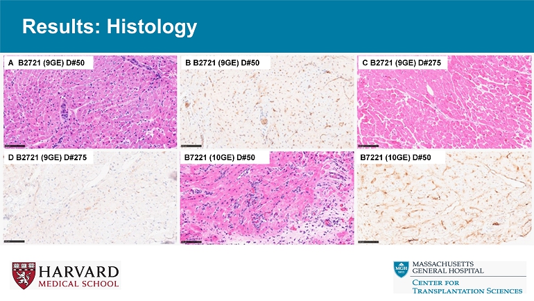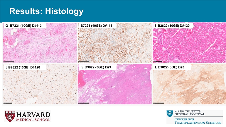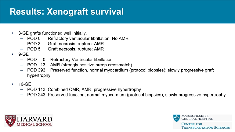 Results: Xenograft survival • 3 - GE grafts functioned well initially. – POD 0: Refractory ventricular fibrillation. No AMR – POD 3: Graft necrosis, rupture: AMR – POD 5: Graft necrosis, rupture: AMR • 9 - GE – POD 0: Refractory Ventricular fibrillation – POD 13: AMR (strongly positive preop crossmatch) – POD 393: Preserved function, normal myocardium (protocol biopsies): slowly progressive graft hypertrophy • 10 - GE – POD 113: Combined CMR, AMR; progressive hypertrophy – POD 243: Preserved function, normal myocardium (protocol biopsies); slowly progressive hypertrophy