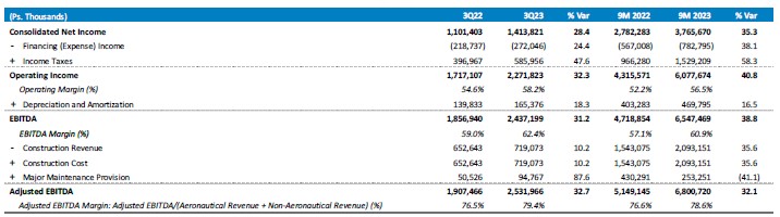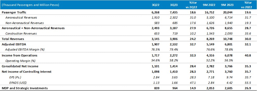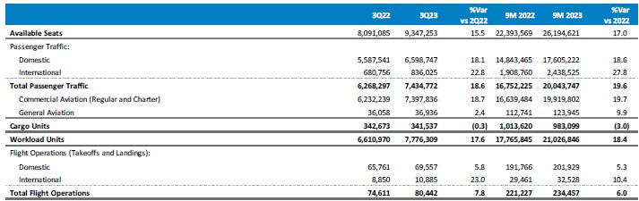 Total passenger traffic reached 7.4 million passengers, an increase of 18.6% as compared to 3Q22. During the quarter, of total traffic, 88.8% was domestic and 11.2% was international.