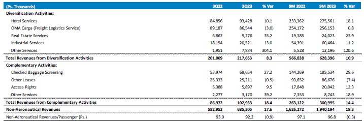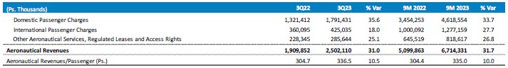 Aeronautical revenues increased 31.0% mainly due to an increase in passenger traffic, compared to 3Q22, as well as increases in aeronautical tariffs during the first quarter of the current year.
