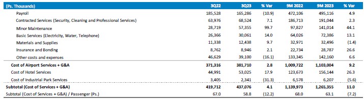 The sum of cost of airport services and general and administrative expenses (G&A) increased 2.8%, mainly due to higher minor maintenance, contracted services and basic services costs, partially offset by lower payroll costs.