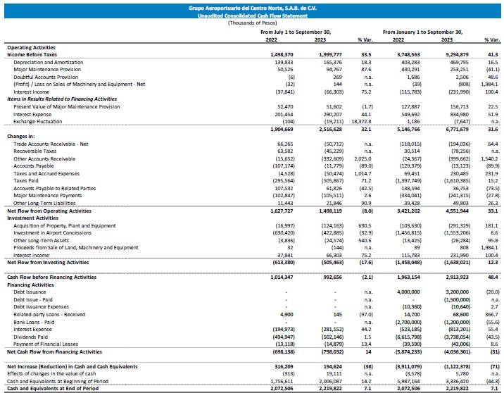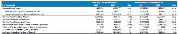 The net increase in cash resulting from operating, investing and financing activities in 3Q23 was Ps.195 million. This, combined with the positive effect of changes in the value of cash of Ps.19.1 million, resulted in a Cash and Cash Equivalents balance as of September 30, 2023 of Ps.2,220 million.