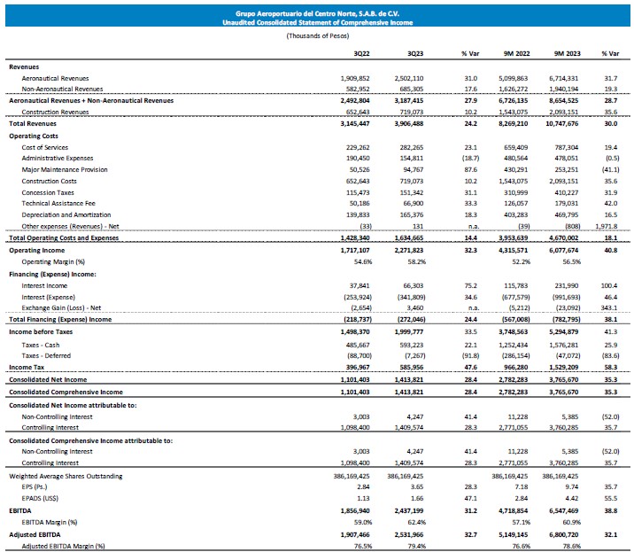 Mexico City, Mexico, October 27, 2023— Mexican airport operator Grupo Aeroportuario del Centro Norte, S.A.B. de C.V., known as OMA (NASDAQ: OMAB; BMV: OMA), today reported its unaudited, consolidated financial and operating results for the third quarter 2023 (3Q23).