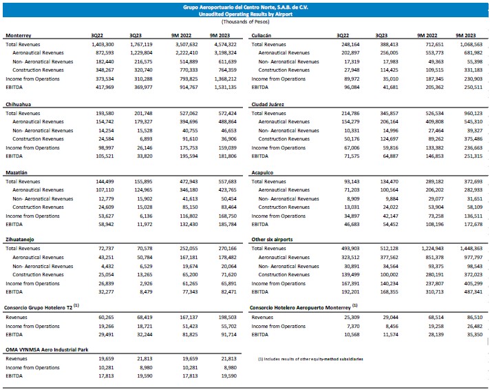 | ● | Passenger traffic increased 18.6% during 3Q23, as compared to 3Q22, reaching 7.4 million passengers. The airports with the highest traffic growth compared to 3Q22 were Monterrey, Culiacán, Ciudad Juárez, Acapulco and Torreón. |