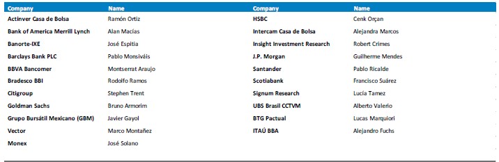 In accordance with the requirements of the Mexican Stock Exchange, the analysts covering OMA are: